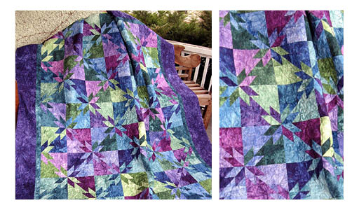 In shades of blue, purple and green batiks, this striking quilt design by Mary B. Hayes looks just like a classic Hunter's Star block, but, it is much easier to make because Thangles eliminates the need to do complicated Y seams. All you do is make half square triangles with Thangles and piece the simple block. When the blocks are put together, the Hunter's Star is revealed.