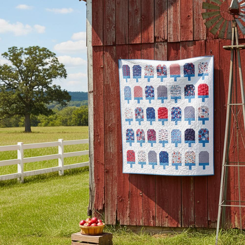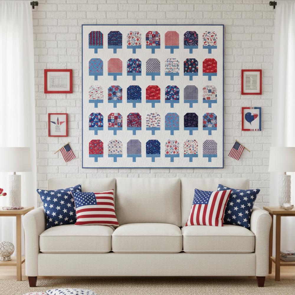 Fun mini prints made even more special with their patriotic themes! Be ready for the 4th of July and summertime with this yummy design filled with frozen treats. Prints include florals, flags, bows, paisleys, stars, fireworks and more all in the most classic red, white and blue palette. The Summertime Fun Quilt Kit includes pattern by Wendy Sheppard and all the fabrics needed, including 5" x 5" precut squares, for the top and binding from the Patriotic Minis collection for P&B Textiles. Finished size is 45" x 45". Backing available separately, 3 yards x 44" wide is recommended.