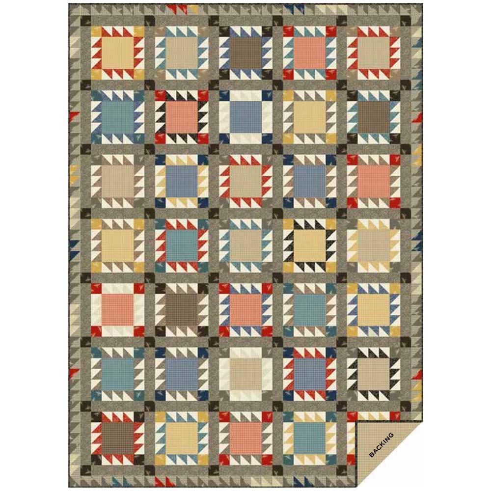 These time-honored blocks are a variation of the traditional Double Sawtooth, surrounded by neutral sashes and black setting squares, known as "posts" in some areas of the country. The outer pieced border adds a fun final touch.