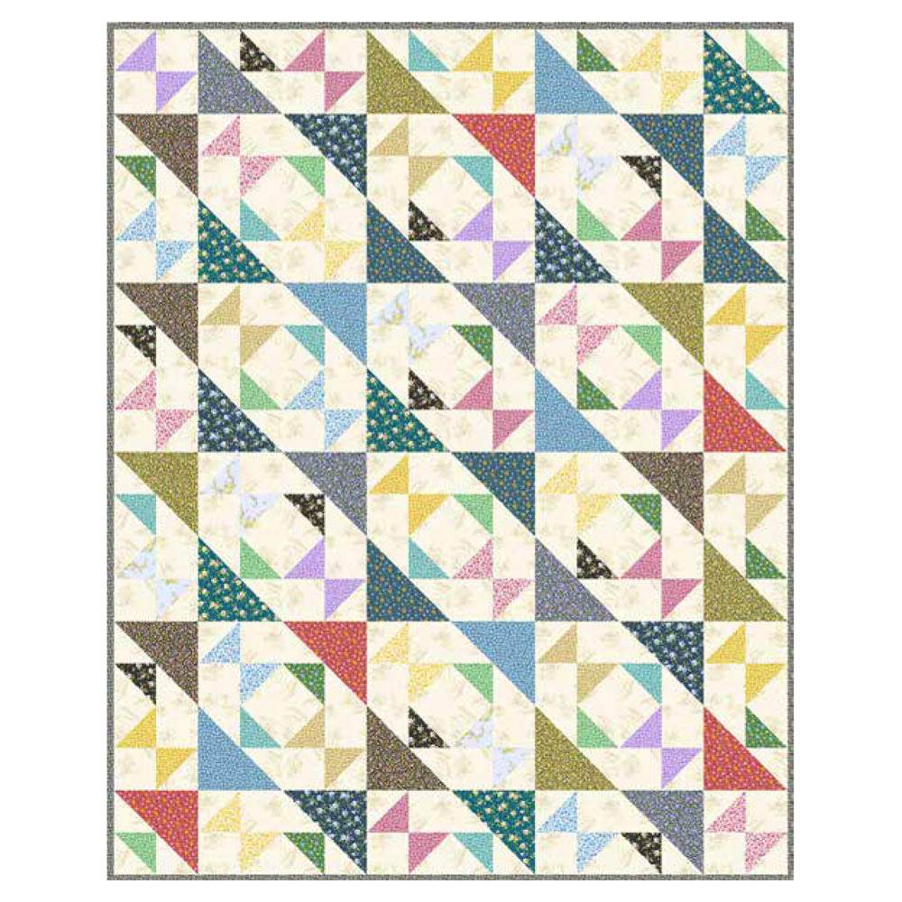So many settings are possible with this traditional pieced block. In this version, the blocks are set in the same orientation, which results in strong diagonal lines moving across the quilt. Place the darker prints in the larger triangles to enhance the image.