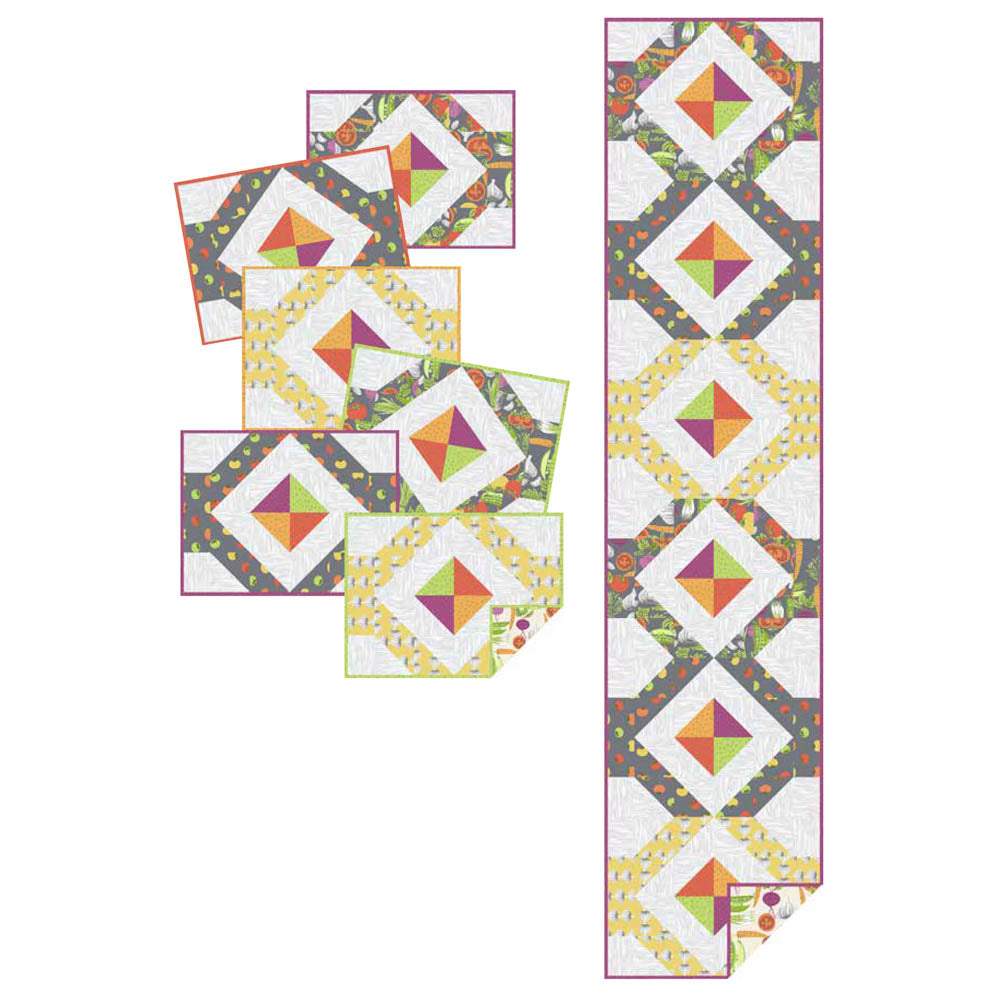 Choose your favorite colorful fabrics for these two table top projects to brighten up any meal. The focus is the fun novelty prints with vegetable garden images. Simple piecing techniques make this project easy enough for beginning quilters.