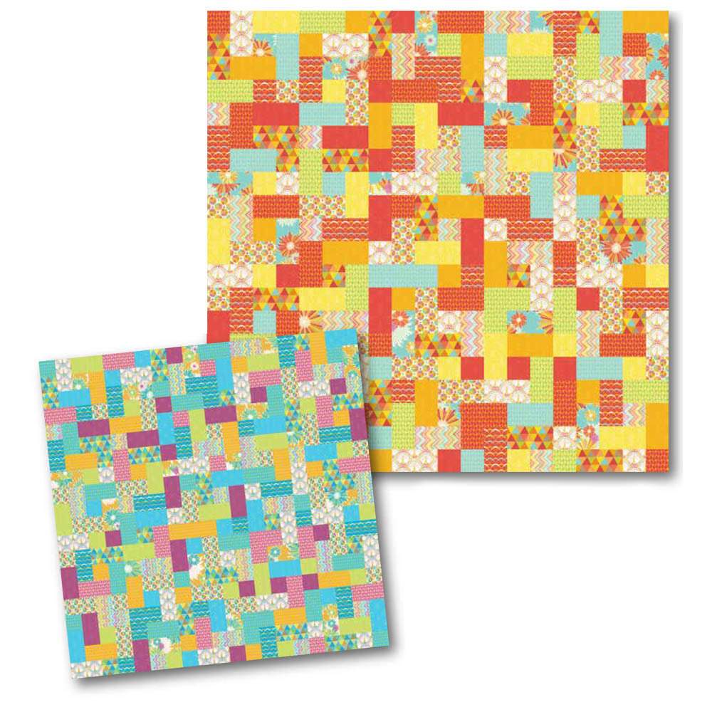 Where’s the block? Actually, where are the two blocks? The scrappy, multiple-patch blocks fool the eye as they meld into one another. The rich, vibrant colors and fanciful prints create a delight for the eye. Easy piecing and large patches make quick work of this queen-size topper.
