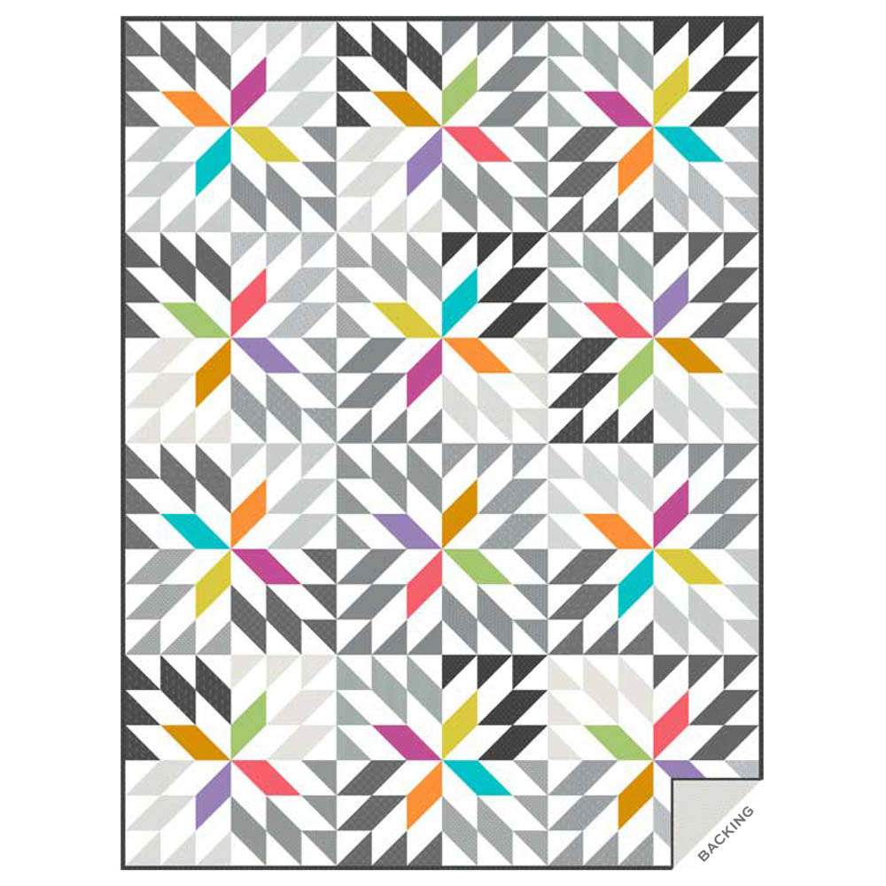 Eye-popping pinwheels twirl in the middle of gray and white stars. The over-sized half-square triangle patches make this full-size quilt a snap to make. The fun will come when you use your own color sense to plan fabric combinations.