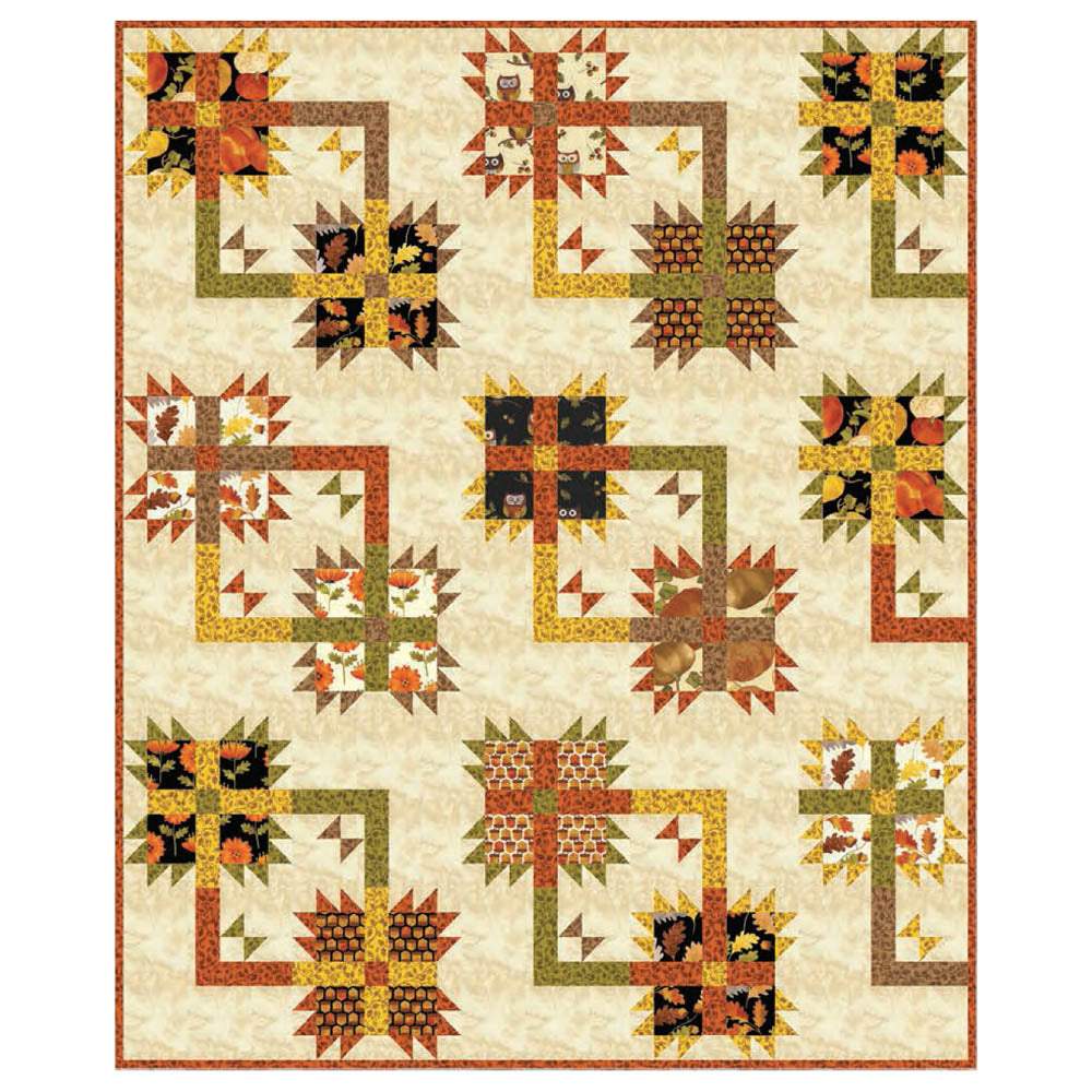 This fun and modern quilt uses vibrant fall colors and fun autumn prints that blend together beautifully in unique quilted blocks. So grab your partner and let's Square Dance!