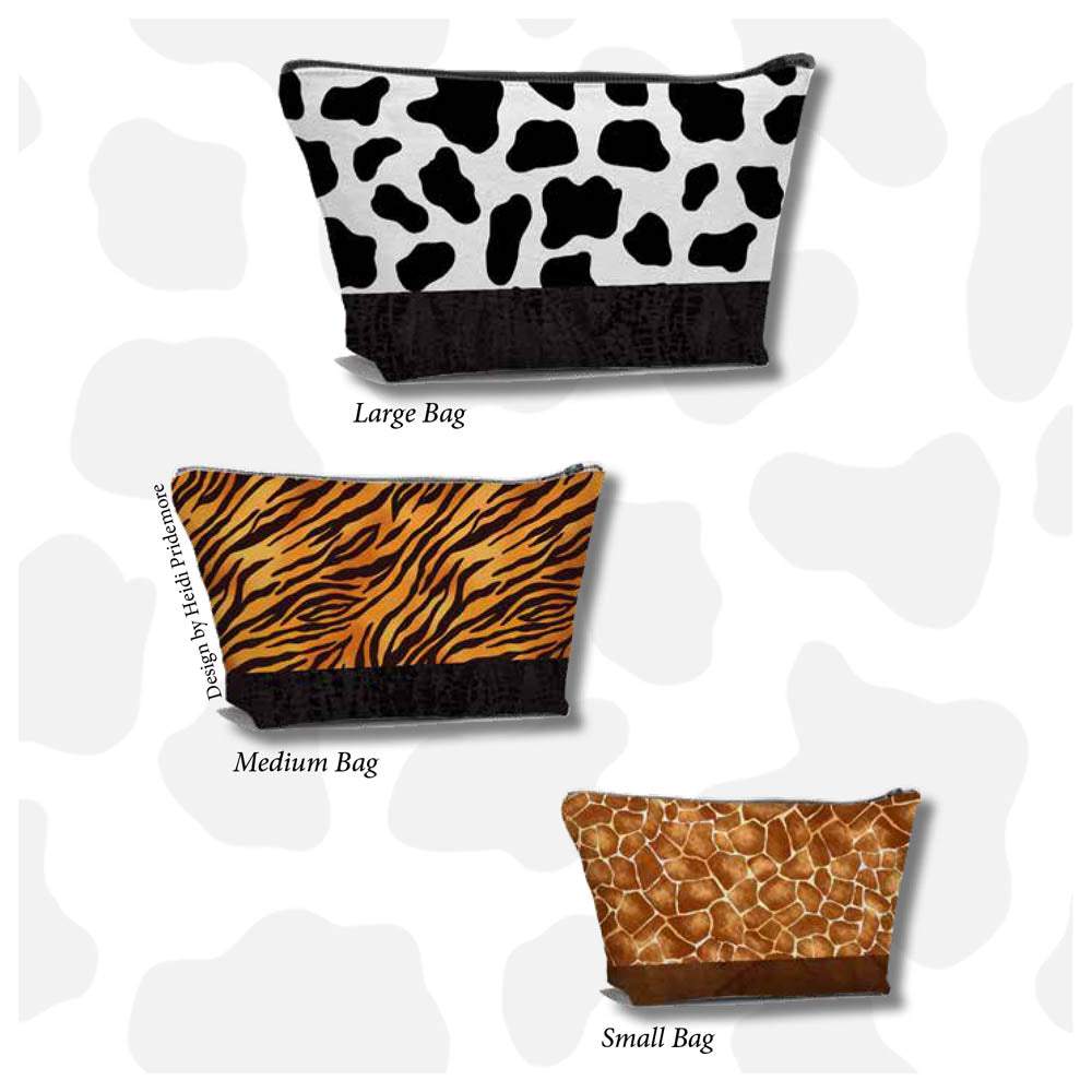 The Skin Deep Makeup Bags Pattern is by Heidi Pridemore and includes instructions for three different sizes, small; 7" x 6" x 2", medium; 9" x 7 1/2" x 2" and large; 11" x 10" x 3".