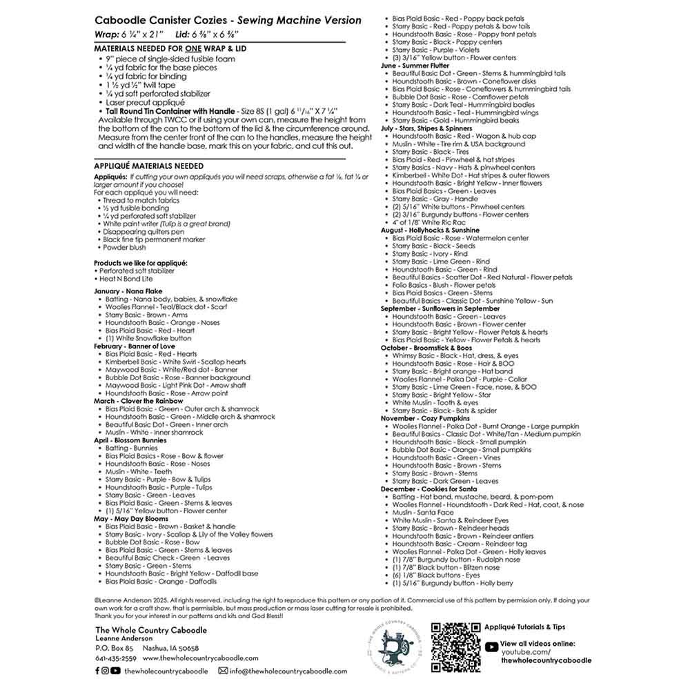 Sew up a year of fun with Caboodle Canister Cozies! This pattern is created for use with a sewing machine and includes full instructions to make a custom wrap and lid for your canister, along with 12 seasonal appliqué designs, one for each month of the year.