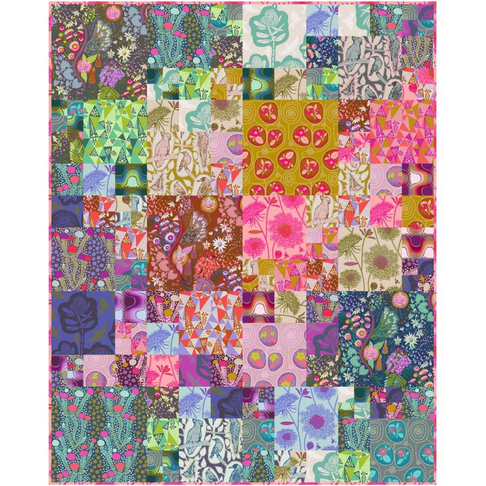 Celebrate all of the vibrant prings with this easy-to-piece design. Simple squares and large pieced blocks in bold prints are intermingled, blending and blurring the rainbow prints in an explosion of riotous color.
