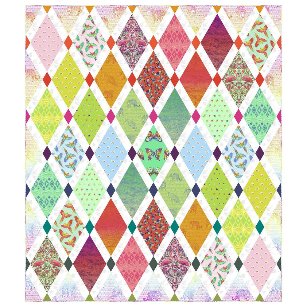 Techniques required to make this diamond design are fussy cutting, 60° ruler cutting and angled piecing. Pattern by Stacey Day and includes paper templates.