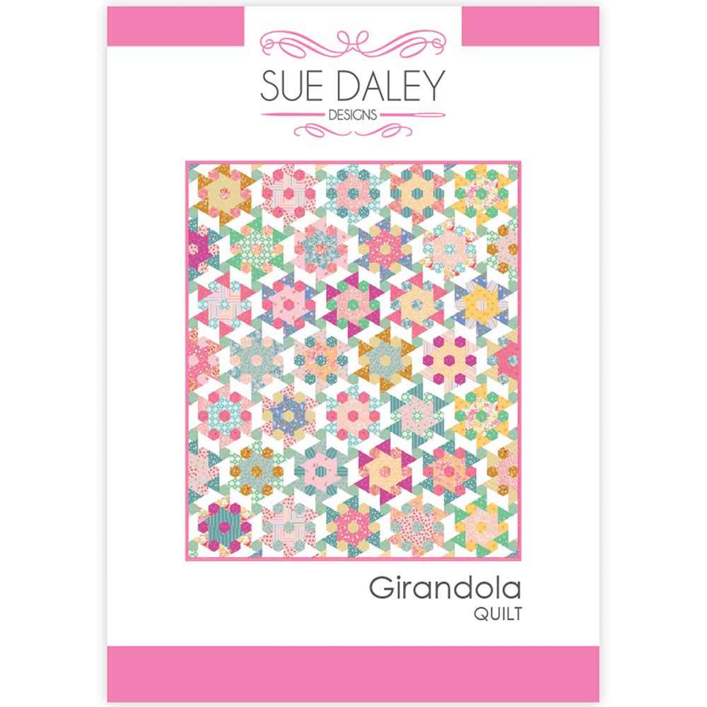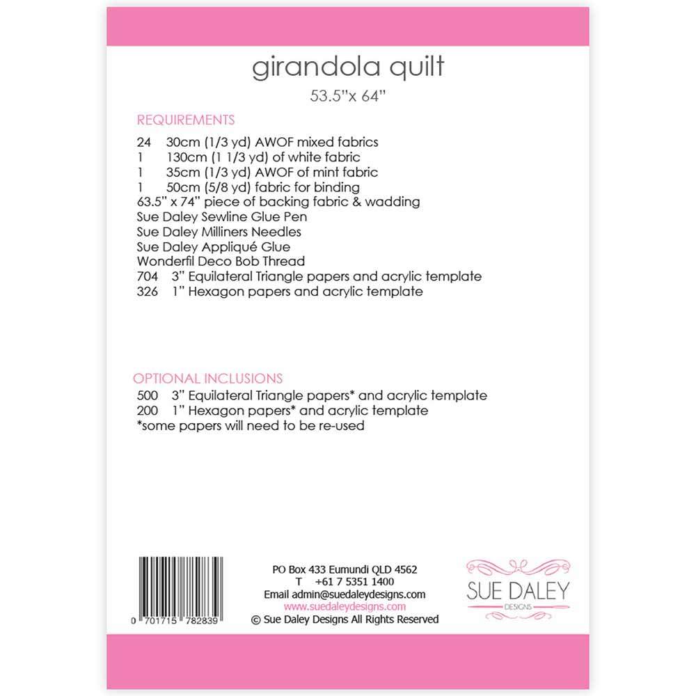 Approx. size: 53 1/2"x 64" Discover the beauty of the Girandola Quilt Pattern, designed with the advanced beginner in mind! This stunning quilt, measuring 53 1/2" x 64", is created using the classic technique of English Paper Piecing. It features a delightful combination of two timeless shapes—equilateral triangles and hexagons—that artfully form intricate pinwheel blocks. The blocks are joined with soft aqua and white joiner blocks, creating a harmonious flow throughout the design. The muted colour palette has been thoughtfully curated from various designer collections, ensuring a cohesive and sophisticated finish. Whether expanding your quilting skills or looking for your next beautiful project, the Girandola Quilt is the perfect blend of elegance and creativity. Pattern inclusions: Pattern instructions 500 x 3" equilateral triangle pre-cut papers & acrylic template 200 x 1" hexagon pre-cut papers & acrylic template Note: An additional 204 3" equilateral triangles 126 1" hexagon papers will be required if you prefer not to re-use your papers
