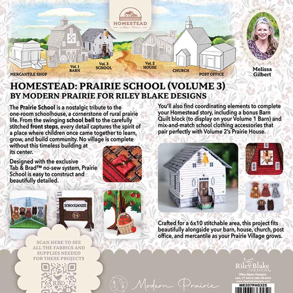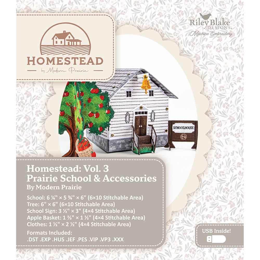 The Prairie Schoolhouse & Accessories (Volume 3) of the Prairie Homestead Machine Embroidery collection by Modern Prairie brings the warmth and simplicity of prairie life to your home. This collection features our patent-pending Tab & Brad™ system, a no-sew assembly method that transforms the way freestanding structures are created in the hoop! Designed to evoke the nostalgia and fond memories of primary school, the Prairie Schoolhouse includes a freestanding sign and apple tree, complete with a basket of fresh-picked apples. We've also included a set of school uniforms and outfits to hang on your clothesline at the Prairie House (Volume 2), as well as a new quilt block design to hang on your Prairie Barn (Volume 1). Add piece by piece to this timeless vision of time when life slowed down, and fleeting moments turned into treasured memories. New buildings, asset packs, and more will be released every few months so you can continue to build your Prairie Homestead collection.