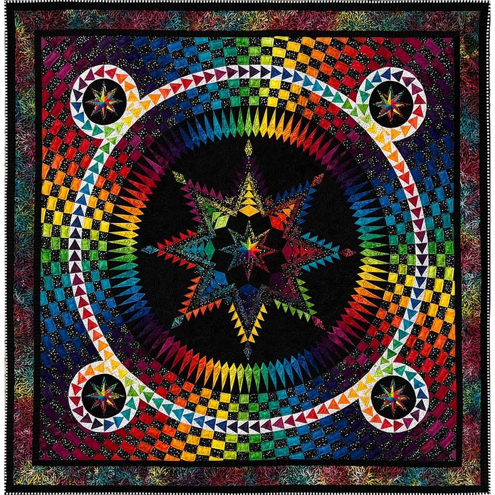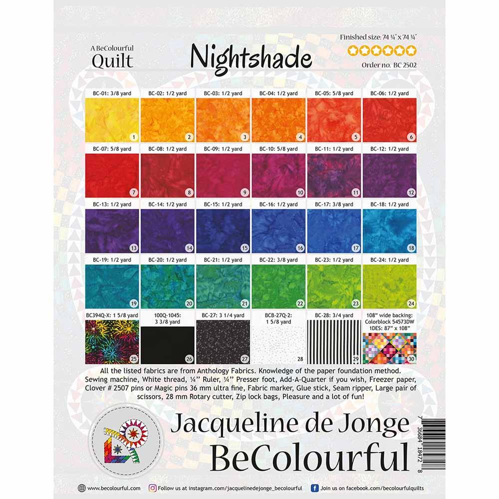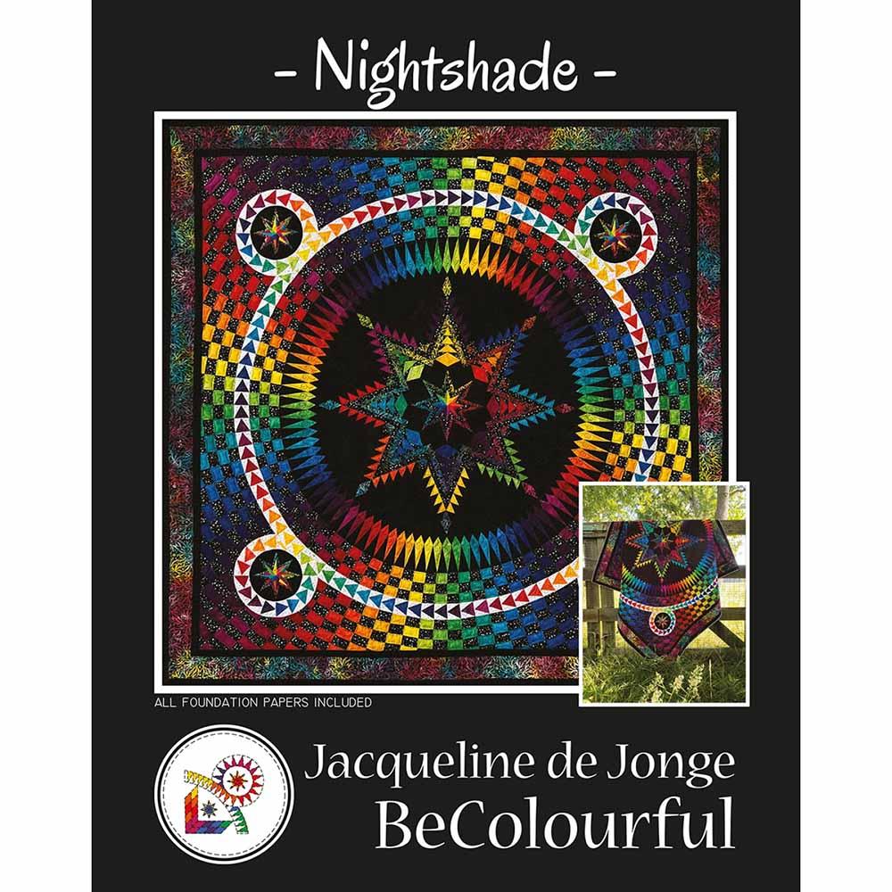 A beautiful design made by Jacqueline de Jonge. The BeColourful Rainbow collection and 5 of her basic signature fabrics of Anthology fabrics are used for this stunning quilt. The large center star and the mosaic border turned this quilt into a paper piece dream for your customers. The pattern includes 2 booklets: 1 colorful booklet with the cutting instructions and 1 booklet with diagrams and description how to make Nightshade.