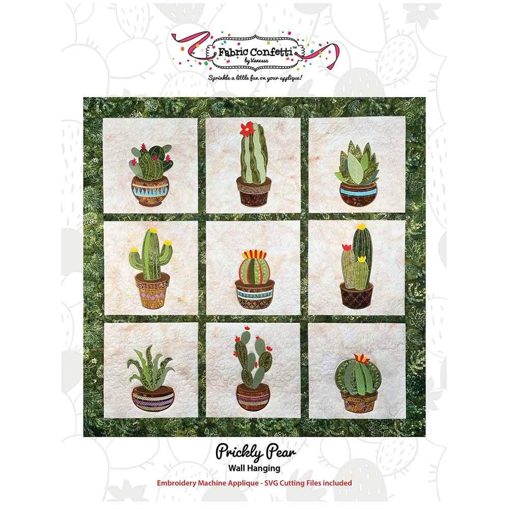 This Prickly Pear Wall Hanging embroidery applique pattern is based on UPDATED versions of my Prickly Bloomsand More Prickly Blooms patterns. I have increased the satin stitch width and simplified some of the fill patterns. This pattern contains the following:Design files and instructions for the Prickly Pear Wall Hanging, in the following formats: .DST, .EMB, .EXP, .HUS,.JEF, .PES, .VP3. The blocks can be stitched out two ways:Designs Only: each of the nine cactus designs range between 5” x 7” and 5” x 93/4”. A hoop that is at LEAST 160mmx 260mm (6.25 x 10.25) is required. Pre-quilting for Designs: Although it is a bit more work, I have included design files for pre-quilting your blocks for designs. The 111/4” x 111/4” blocks will each require two hoopings. A hoop that is at LEAST 200mm x 300mm (8.00 x 12.00) is required. After quilting your blocks, you can then proceed to the nine cactus designs. Also included are Mirror and Non-Mirror templates for cutting out shapes by hand and PDF templates and SVG cutting files that can be used with your preferred electronic cutting machine.