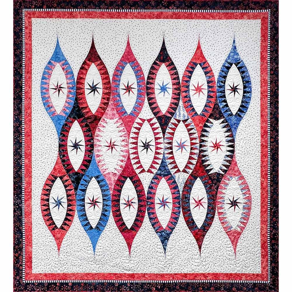 Winter Whisper is made with the HOHOHO winter collection and has gold and silver sparkle accents on the batik, designed for Anthology. However, in 2017 Jacqueline designed a quilt called “Arabian Nights” and so many quilters mentioned to her that this design reminded them of Christmas days at their grandparents’ house, hanging fragile glass Christmas ornaments in the freshly cut tree. Jacqueline told us that she looked at “Arabian Nights” again and tried to imagine what this quilt would look like made in this collection.  And here she is: Winter Whisper made in 17 beautiful Christmas ornaments, each in a different fabric combination. Deep blues and reds and a touch of pink and orange. The white with gold fabric looks like snow and adds sparkle to this design.