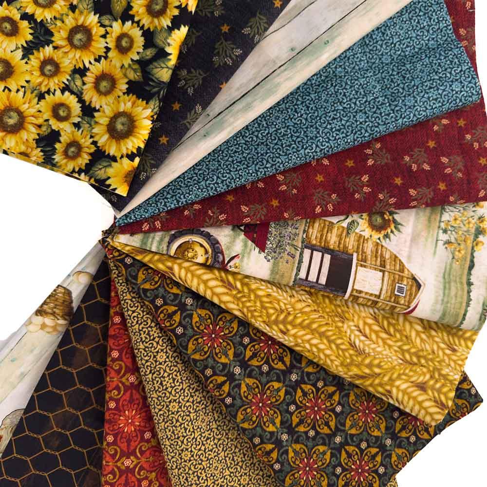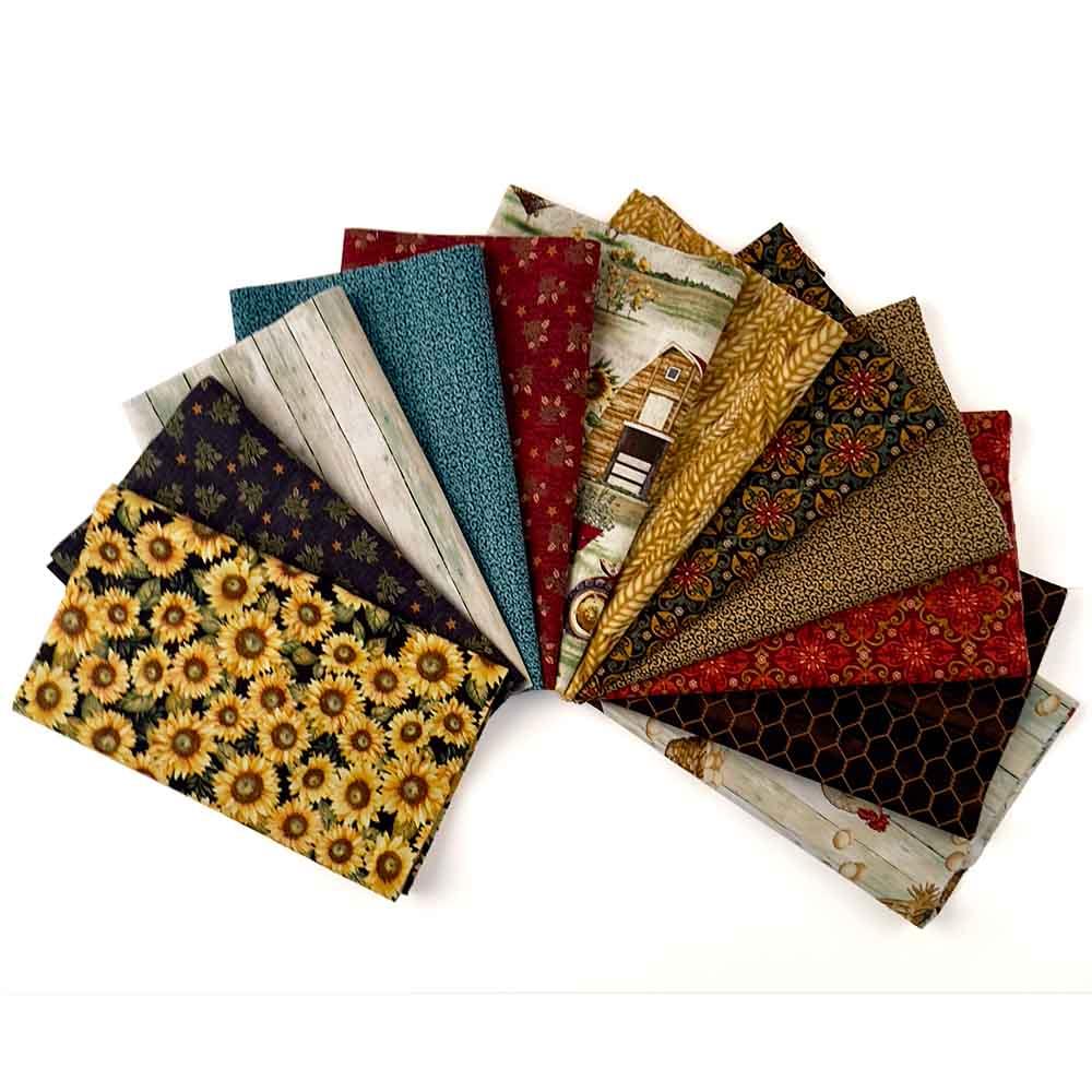 A charming farmhouse-themed quilt fabric line by Jan Mott for Henry Glass featuring playful roosters, sunflowers, rustic pick-up trucks and coordinating prints—perfect for welcoming country-style warmth into your quilting projects. This Quarter Yard collection includes 12 pieces.