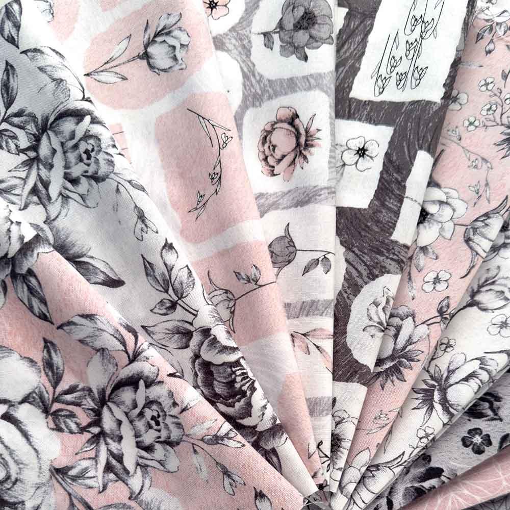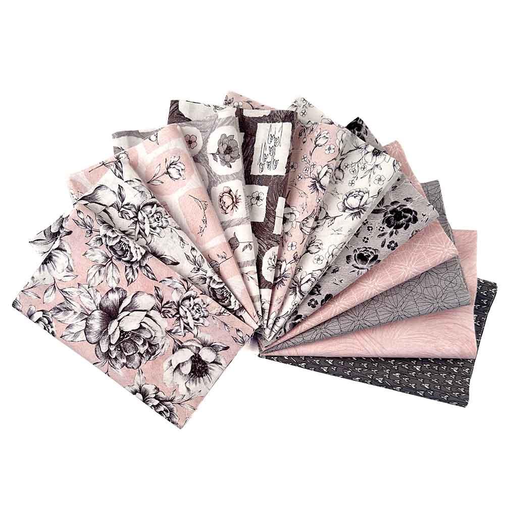 A soft and airy collection of sketch-style florals and gentle textures in charcoal, graphite and blush tones — perfect for creating light, elegant quilts with an understated botanical charm. This Quarter Yard collection includes 12 pieces.