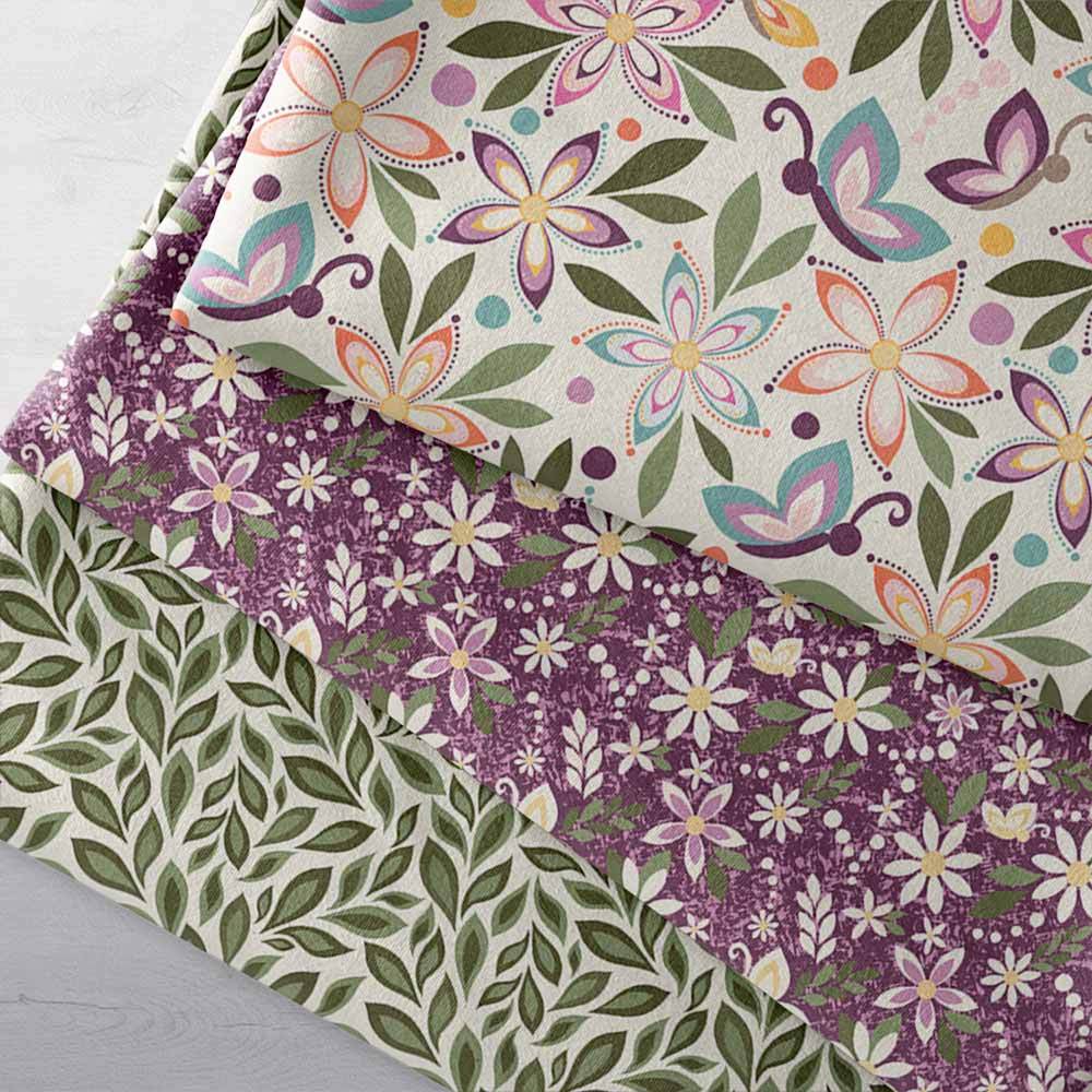 Floral meets fun! Juju’s Petals by Riley Blake brings a fresh spin on nature’s favorite motifs — with bold blossoms and flowing foliage — all in a vibrant palette of pinks, lilacs and greens. Perfect for quilts, bags or home décor, this 100% cotton, coordinated collection gives you everything needed for striking, modern sewing projects. Fabric bundle includes three 1-yard cuts.