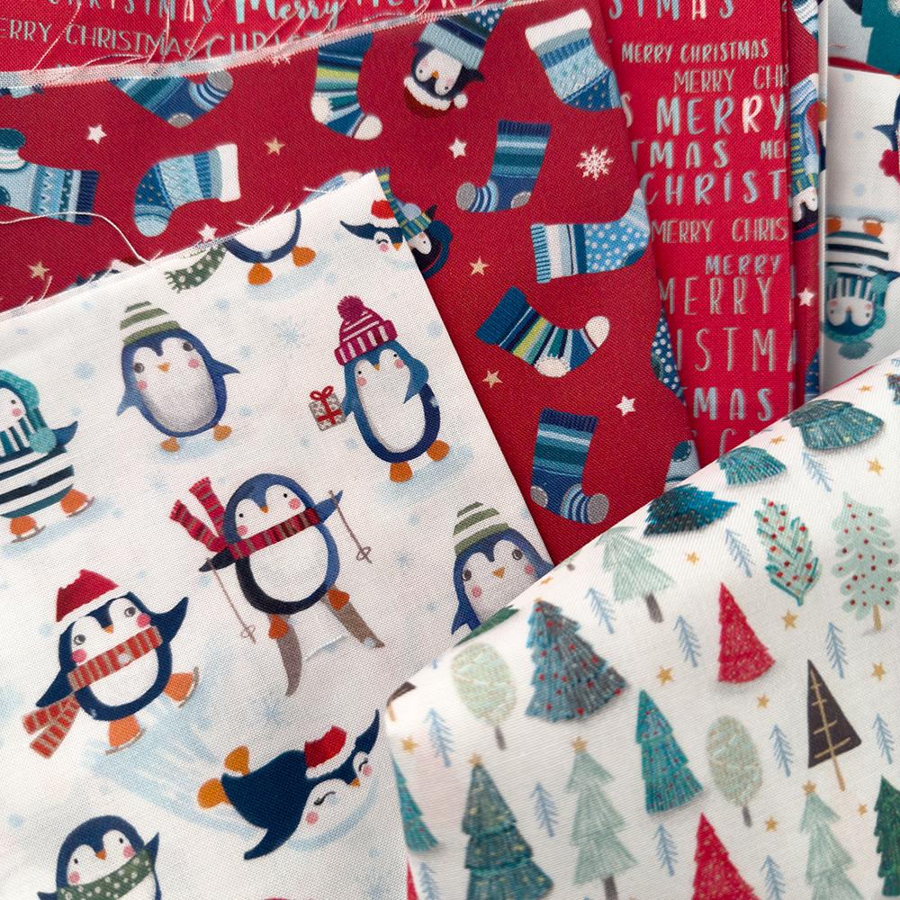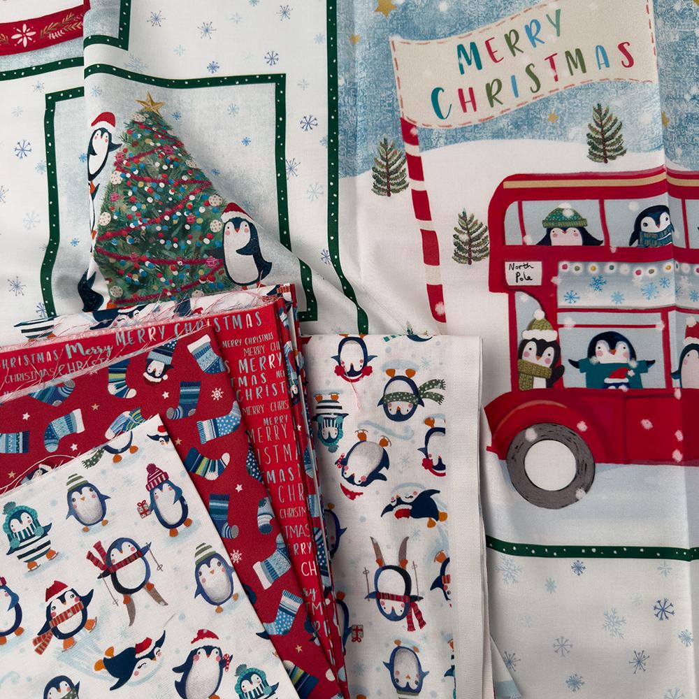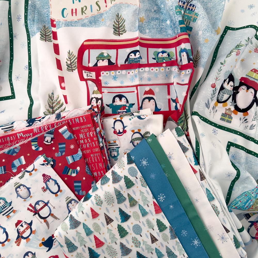 Winter Waddles by Sally Darby for P&B Textiles is a playful winter and holiday fabric collection featuring cheerful penguins, snowflakes, stockings, mini trees, and festive text prints. Designed in bright, wintry colors, this collection will bring fun and whimsy to any seasonal project. Perfect for Christmas quilts, kids’ projects, décor, and winter sewing, the collection includes 5 yards of coordinating yardage and a charming penguin panel.
