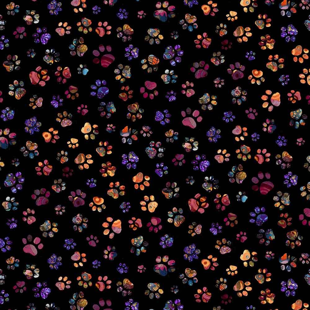 Timeless Treasures - Calico Cat - Digital - Floral Paw Prints - Black - Yardage