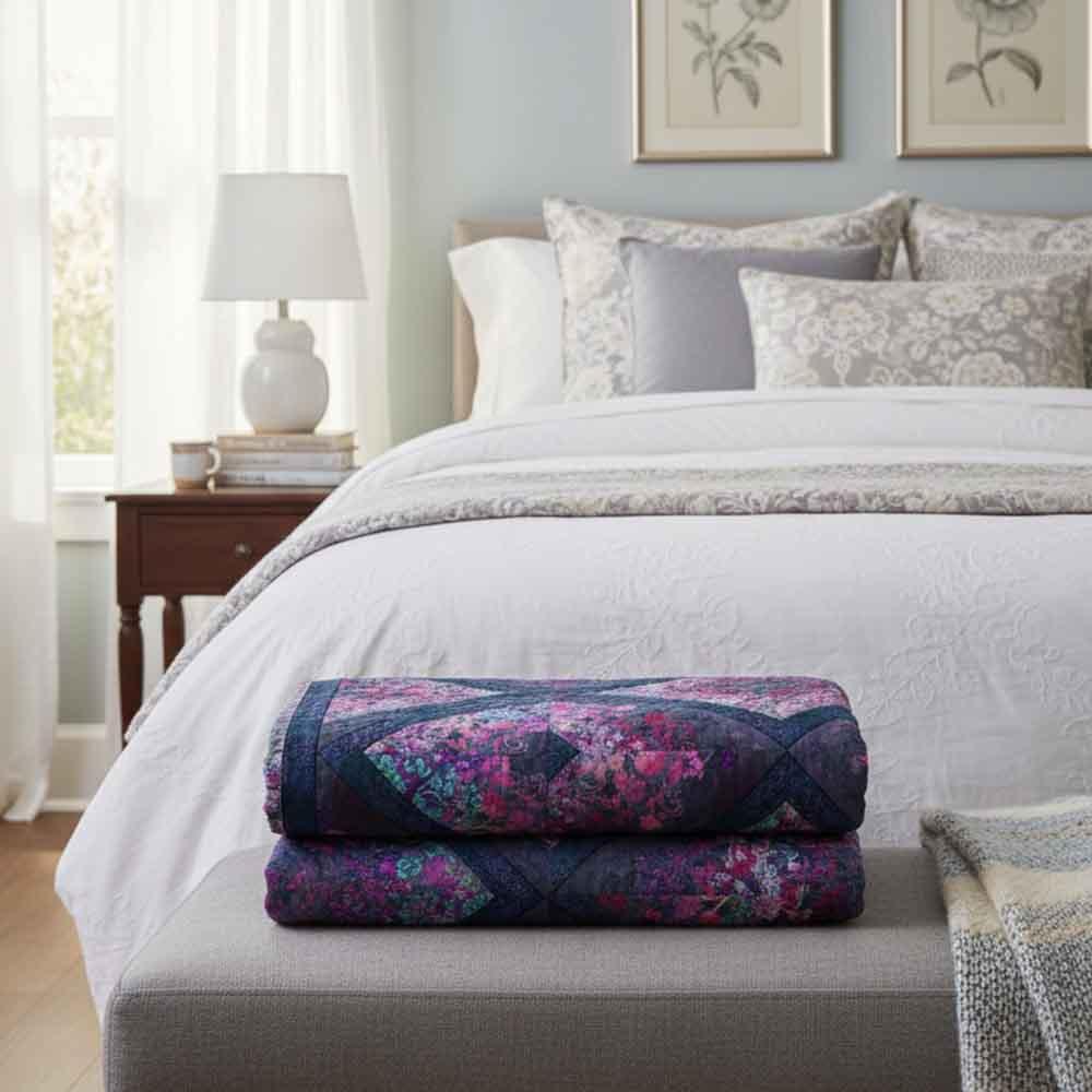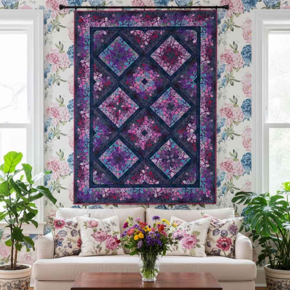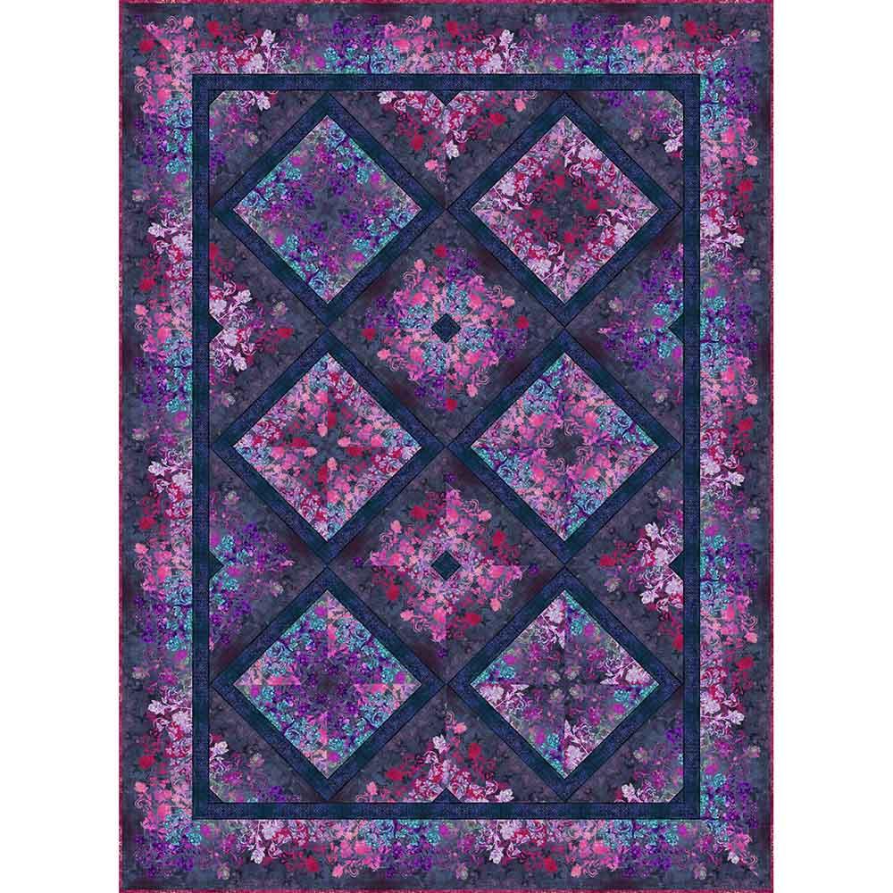Dramatic in color and texture and filled with florals, the Evanescence collection designed by Jason Yenter is featured in this project from In The Beginning. The Evanescence Kaleidoscope Kit in Purple includes pattern and all the fabrics needed for the top and binding of a 73" x 100" quilt. Backing available separately, 7-1/2 yards x 44" wide recommended.