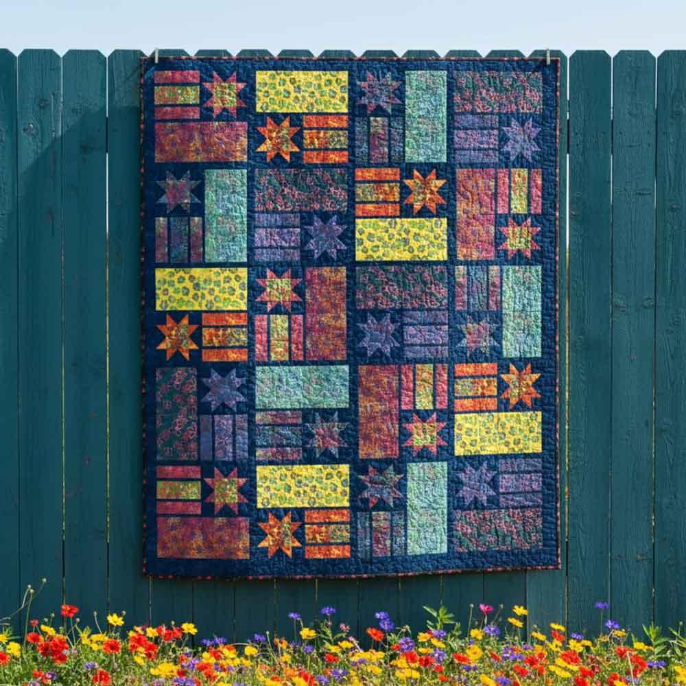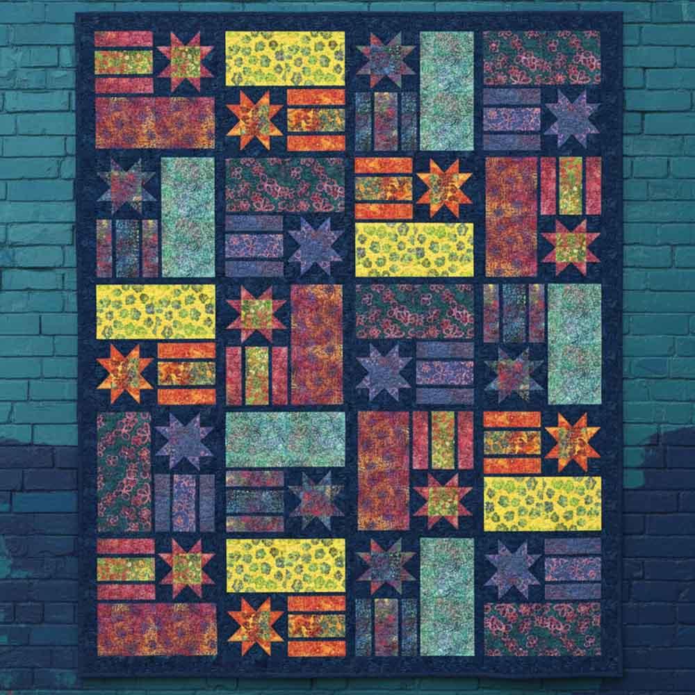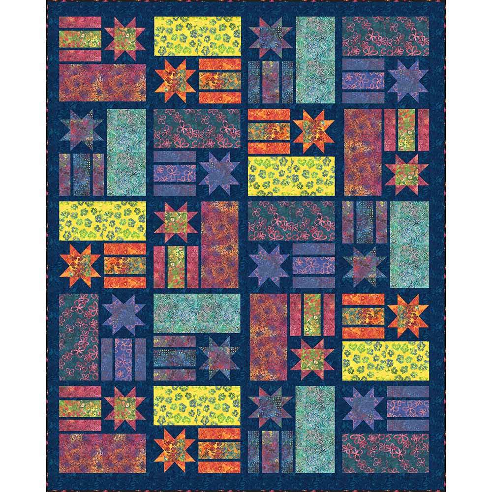The large blocks, stripes and stars all shine in this project that features the Glee batiks by Baliscapes for Windham Fabrics. The Constance Kit includes pattern by Robin Pickens and all the fabrics needed for the top and binding of a 76" x 93" quilt. Backing available separately, 7 yards x 44" wide is recommended.
