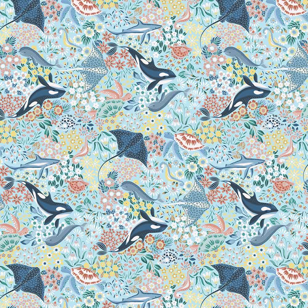 Packed with vibrant blooms and playful sea life, the Vitamin Sea print in Pool 108" wide comes from the Wanderlust collection by Dear Stella.