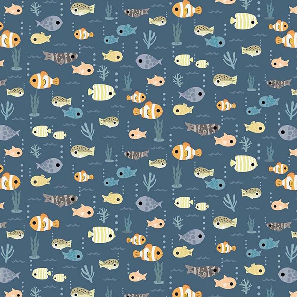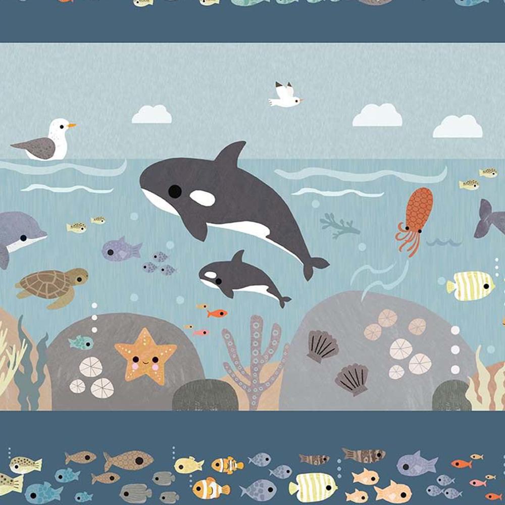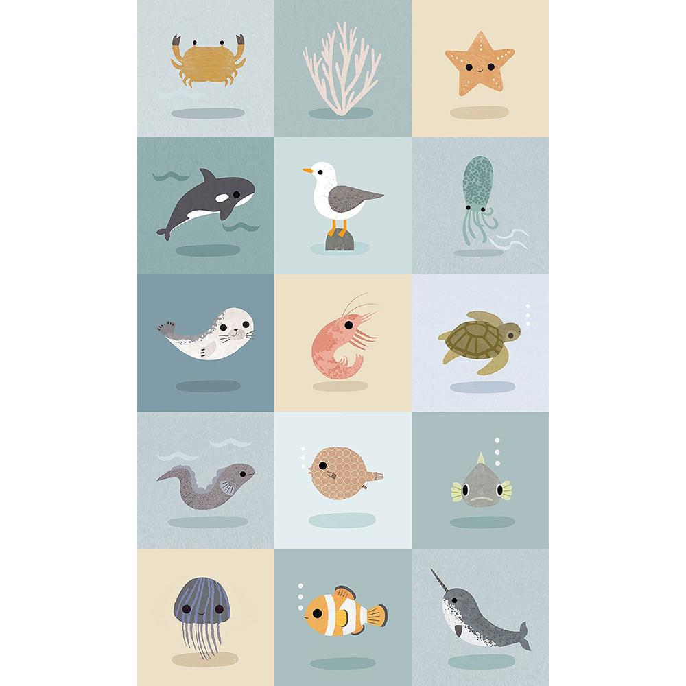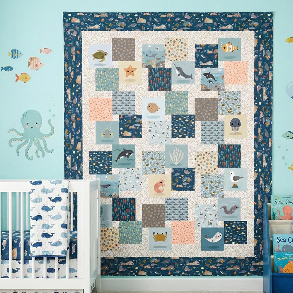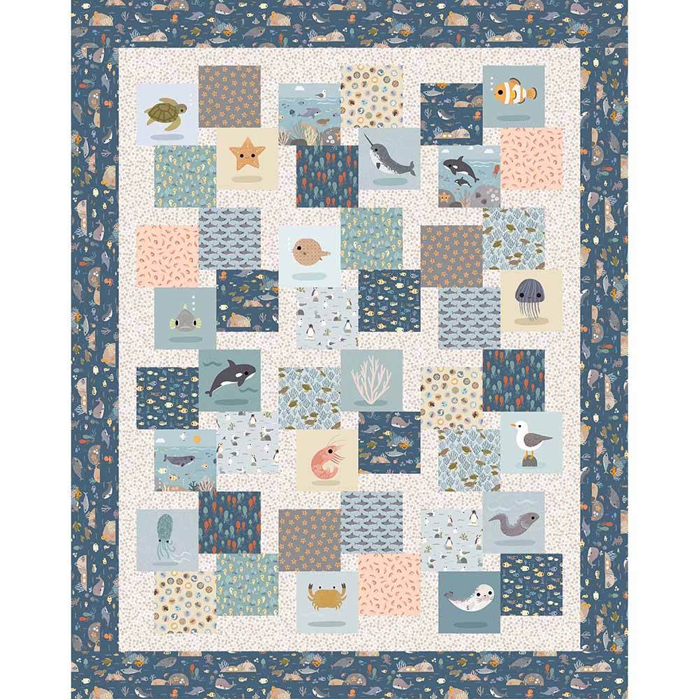The I Spy Kit includes pattern by The Quilt Chef and all the fabrics needed, including panel, for the top and binding from the Beyond the Sea collection by Painted Love Studio. Finished size of this intermediate project is 62" x 78". Backing available separately, 5 yards x 44" wide recommended.