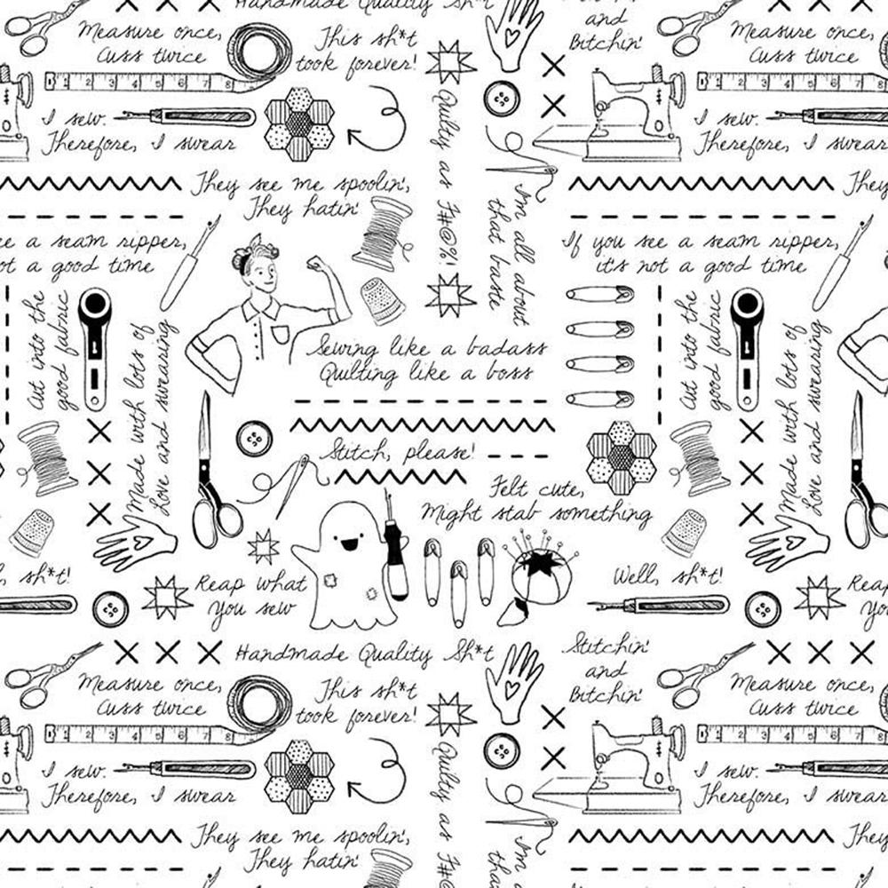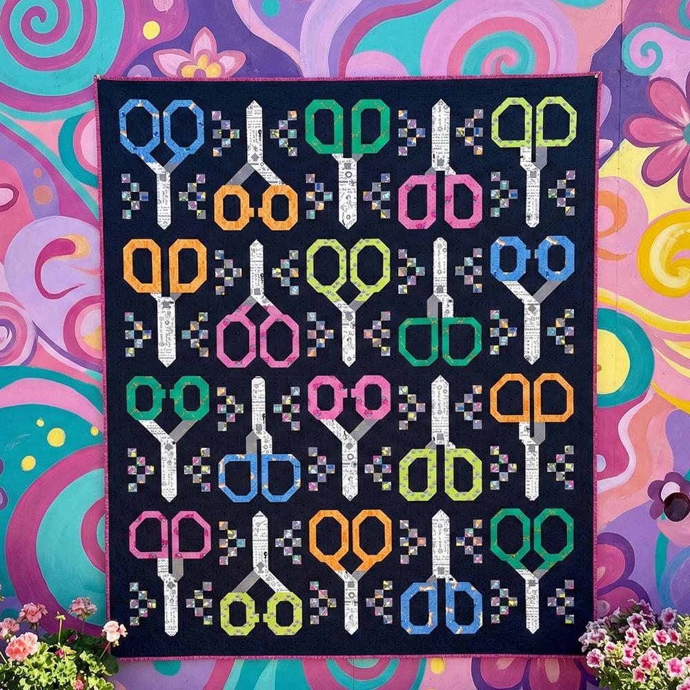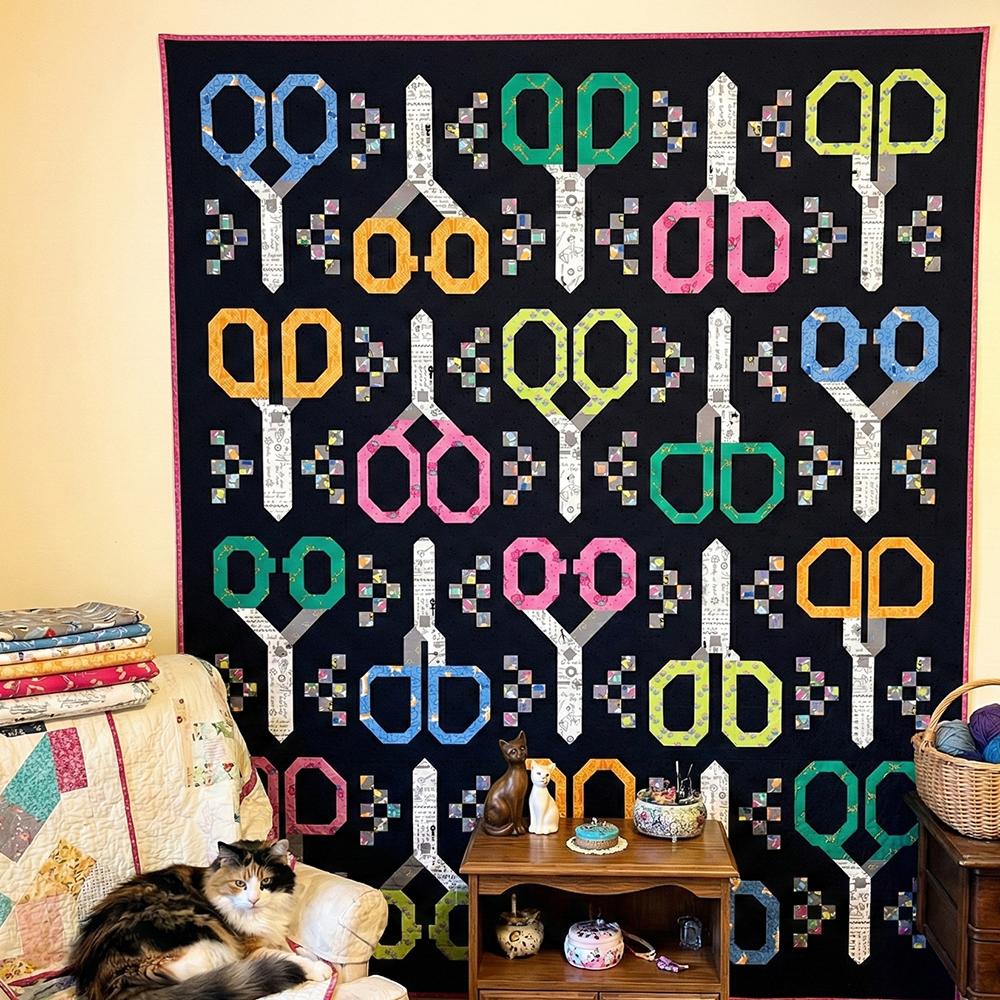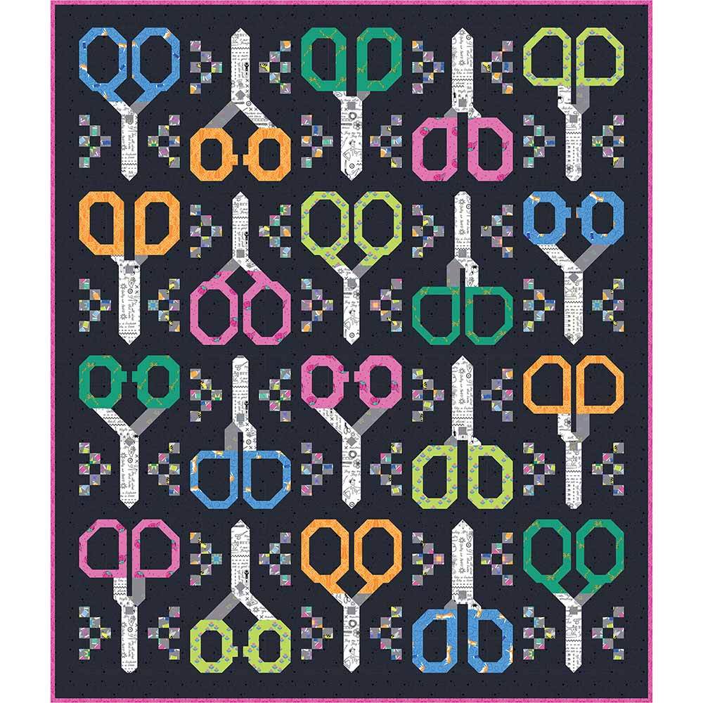 The Stay Sharp project is traditionally pieced and recommended for the intermediate sewist and up. The pattern includes instructions by Pen + Paper Patterns for making four various scissor blocks, each measuring 9 1/2" x 14 1/2". The 21-page pattern is complete with block diagrams, labels for organizing your cuts of fabric, step-by-step detailed instructions, and colorful illustrations. Kit includes pattern and all the fabrics needed for the top and binding from the Quilty Helpurrs collection by Pammie Jane for Dear Stella. Finished size is 58" x 67". Backing available separately, 4 yards x 44" wide recommended.