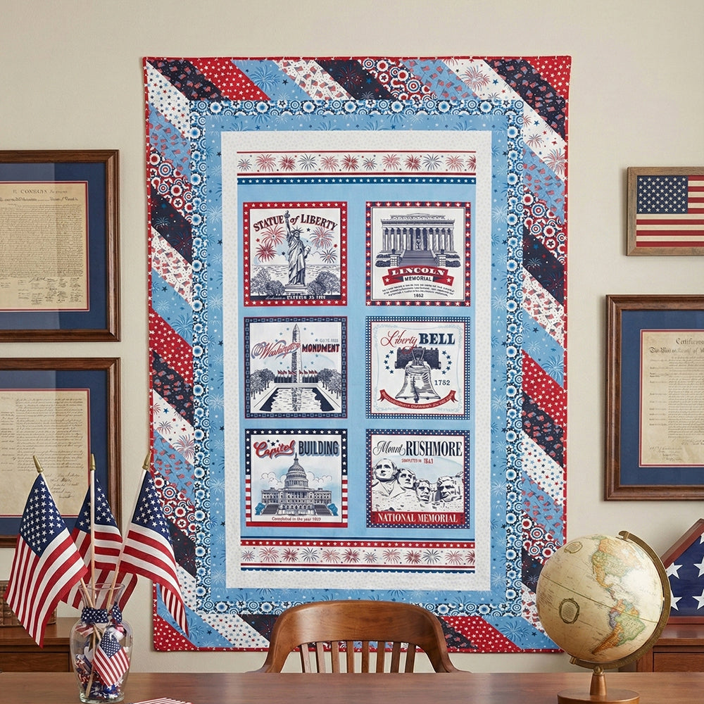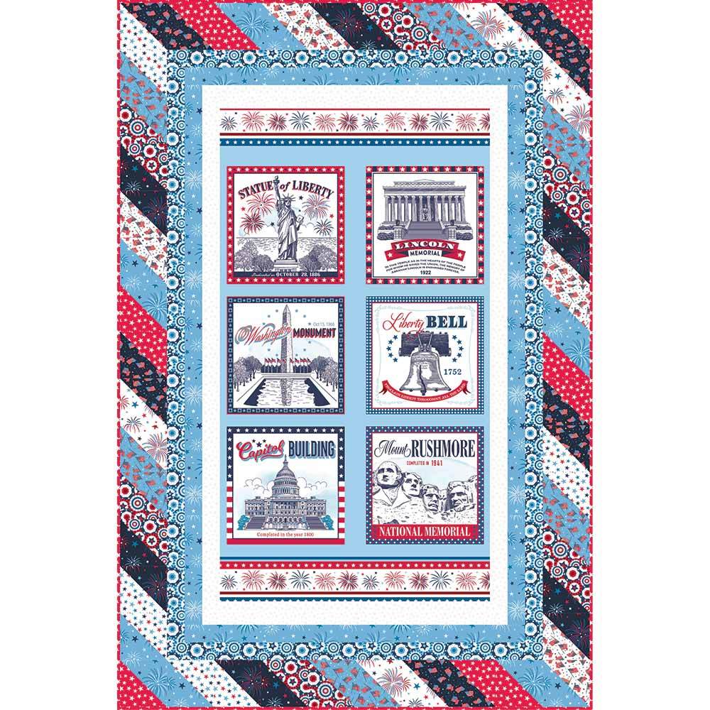 Celebrate the USA with a fabric collection that honors American pride in bold red, white, and blue. The centerpiece is a striking block panel featuring iconic U.S. monuments, perfect for creating statement quilts. Coordinating prints include stars, stripes, and flags that capture the spirit of celebration. Whether for Independence Day projects or everyday Americana décor, this collection brings timeless national pride to your sewing. The Unity Kit includes pattern by Stephanie Sheridan and all the fabrics needed, including panel, for the top and binding from the Celebrate the USA collection by Kanvas Studios. Finished size is 40” x 60”. Backing available separately, 1-1/2 yards x 108” wide recommended.