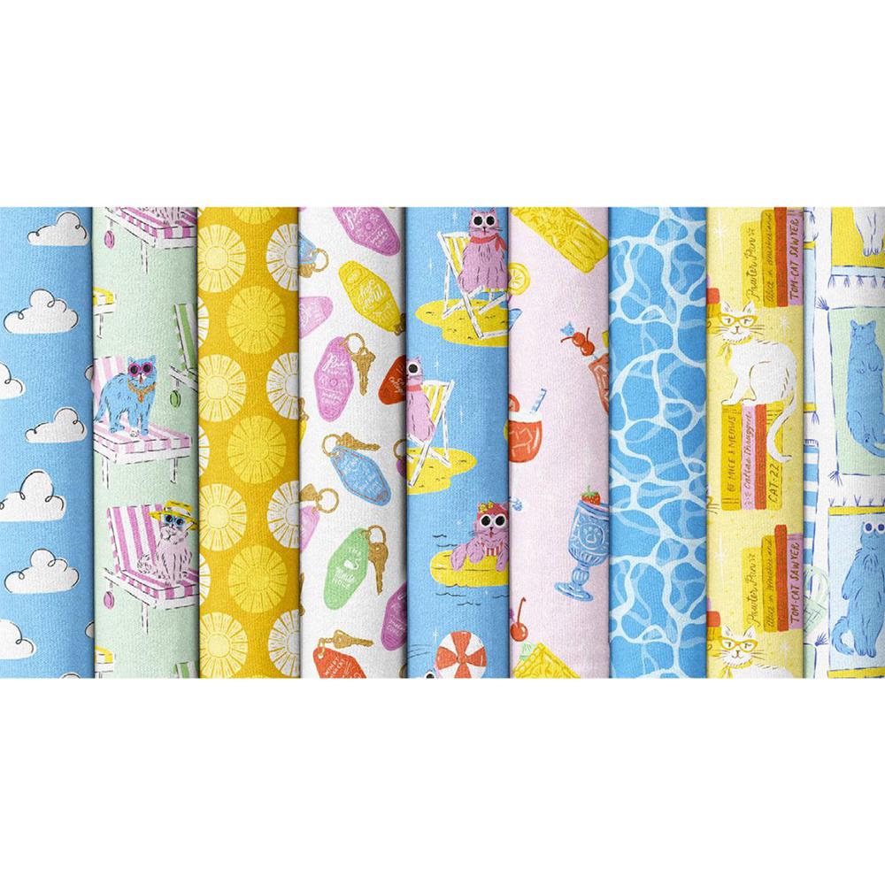 Poolside Purrfection by Krissy Mast for Cloud9 Fabrics is a playful, sun-soaked fabric collection where cool cats take center stage. Featuring a cast of stylish felines lounging poolside, splashing about, and soaking up the summer vibes, this collection is packed with personality, charm, and a healthy dose of humor.
