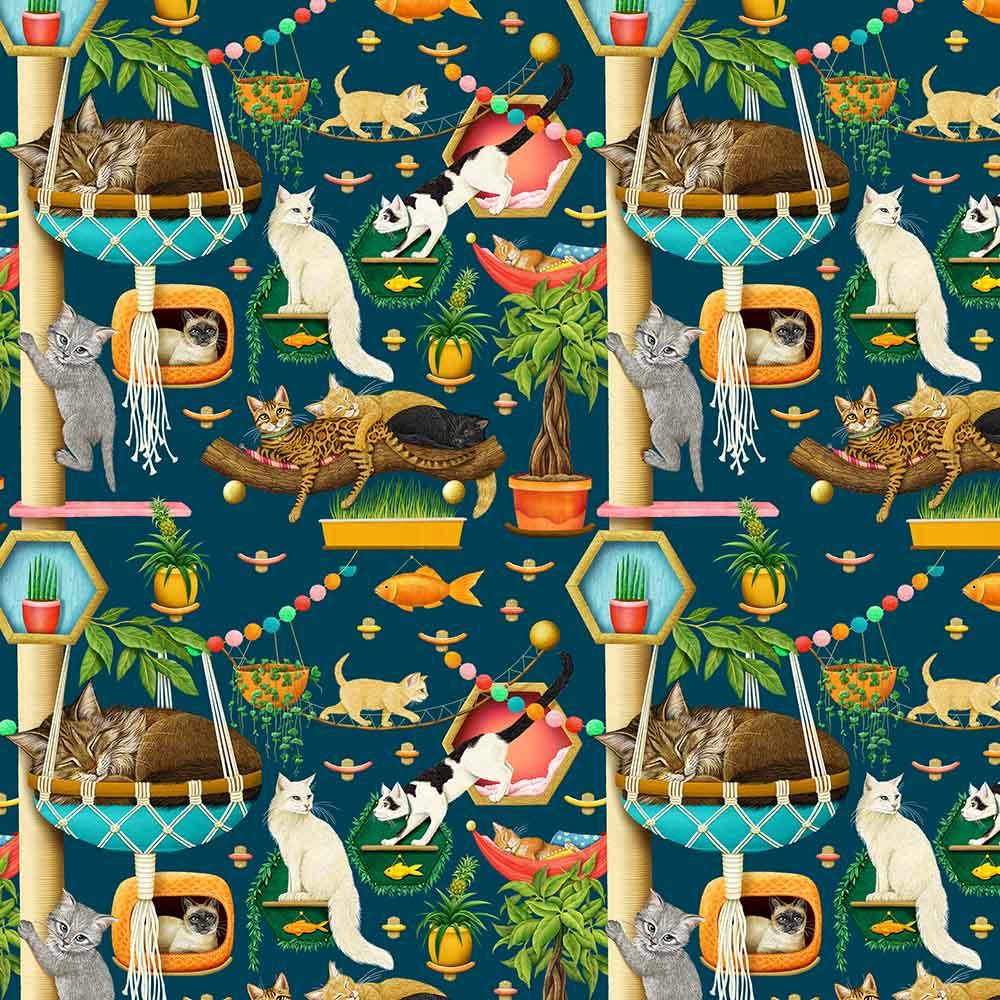 Timeless Treasures - Feline Fanatic - Cat Trees And Perches - Navy - Yardage