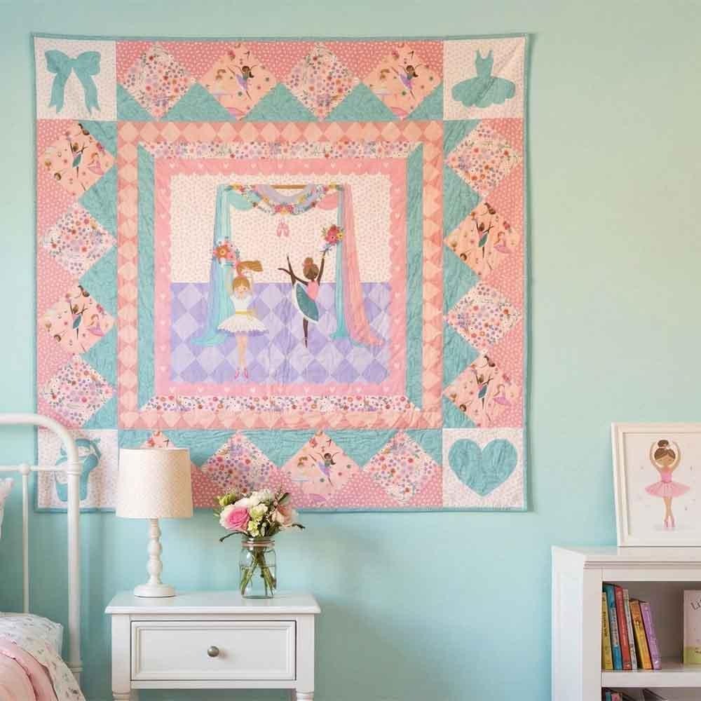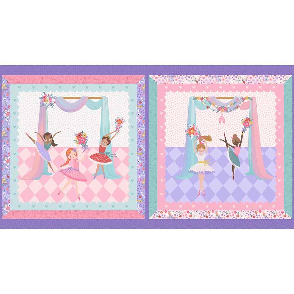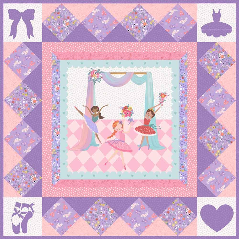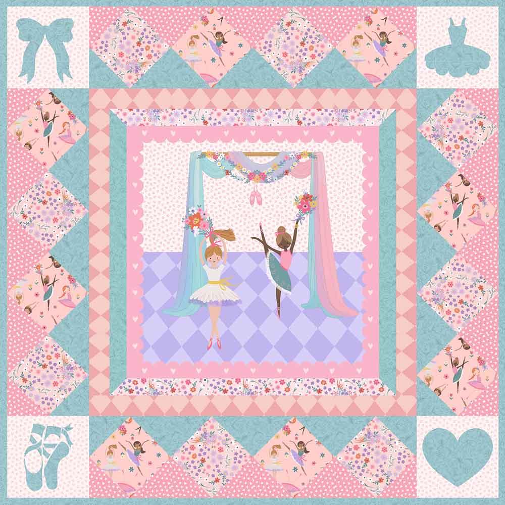 The Ballerina Twirl Quit Kit includes pattern by Lisa Swenson Ruble and all fabric needed, including panel, to complete the top and binding of TWO 36" x 36" quilts. Backing is available separately, 1-1/4 yards x 44" is recommended for EACH quilt.