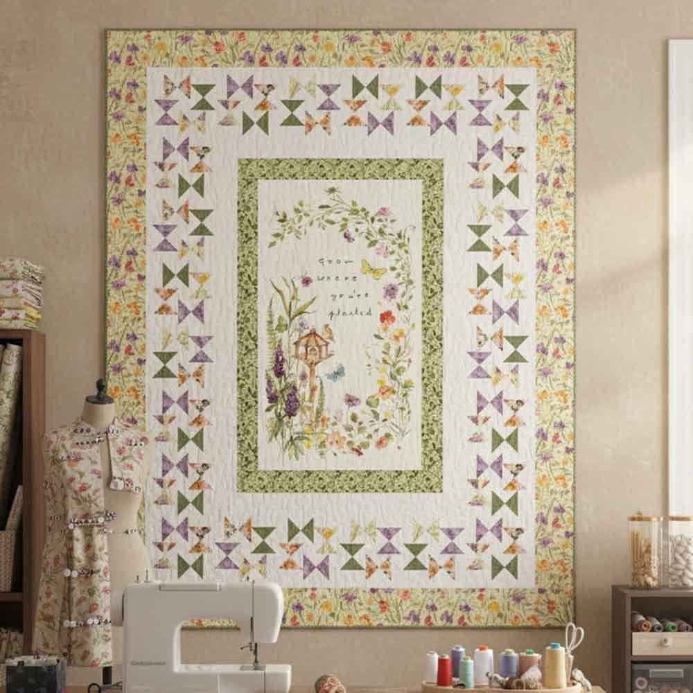 Birds and butterflies enjoy their surroundings filled with color and delicate florals. Half square triangle patterns create a butterfly like border for soft movement. The Butterfly Garden Kit includes pattern by Phoebe Moon Designs and all the fabrics needed, including panel, for the top and binding from the Flourish collection by Hina Mirza for Figo Fabrics. Finished size is 67" x 85". Backing available separately, 5-1/2 yards x 44" wide recommended.