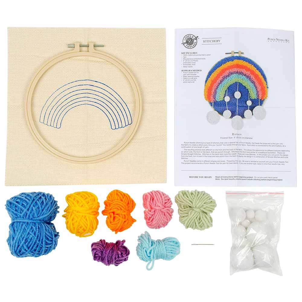 Kit includes 100% Polyester Pre-Printed Panel, embroidery Floss, may include miscellaneous embellishments, 8" plastic locking embroidery hoop and easy to follow instructions. Kit requires a basic knowledge of punch needle. Needle punch tool sold separately. Additional supplies that may be needed are listed on instructions.