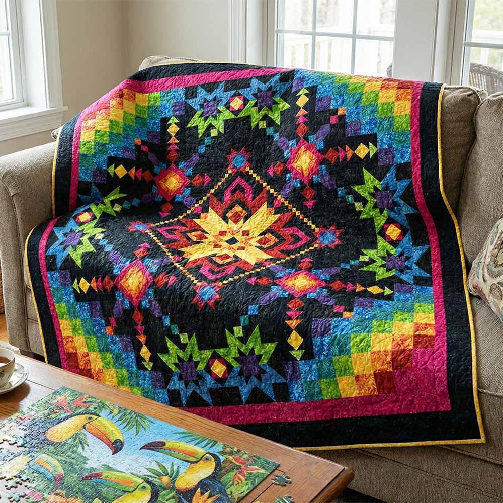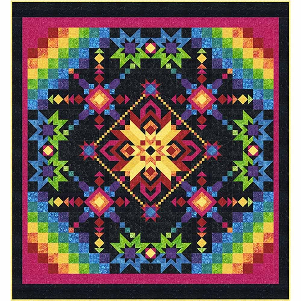 A vivid explosion of color and pleasing gradients, Technicolor by Wilmington Batiks features a glowing starburst medallion in gold, orange, and red, anchoring the quilt center. Surrounding diamond-like star clusters emphasize the radiant hues of the Technicolor pallet. Quilters with a little experience and an intrepid spirit will enjoy creating this rainbow masterpiece!