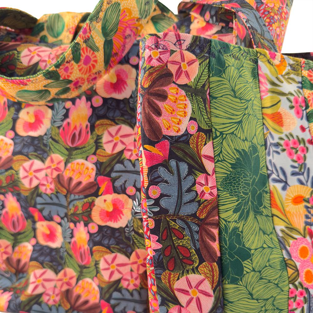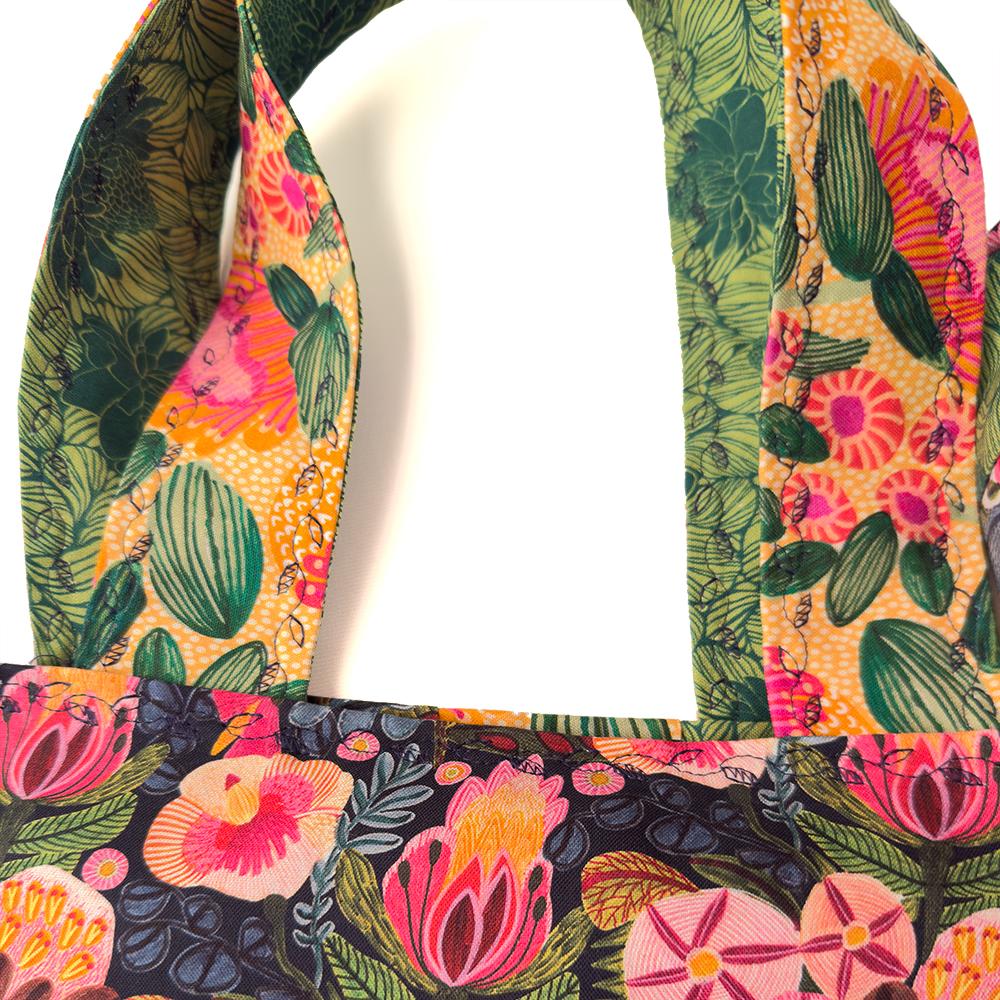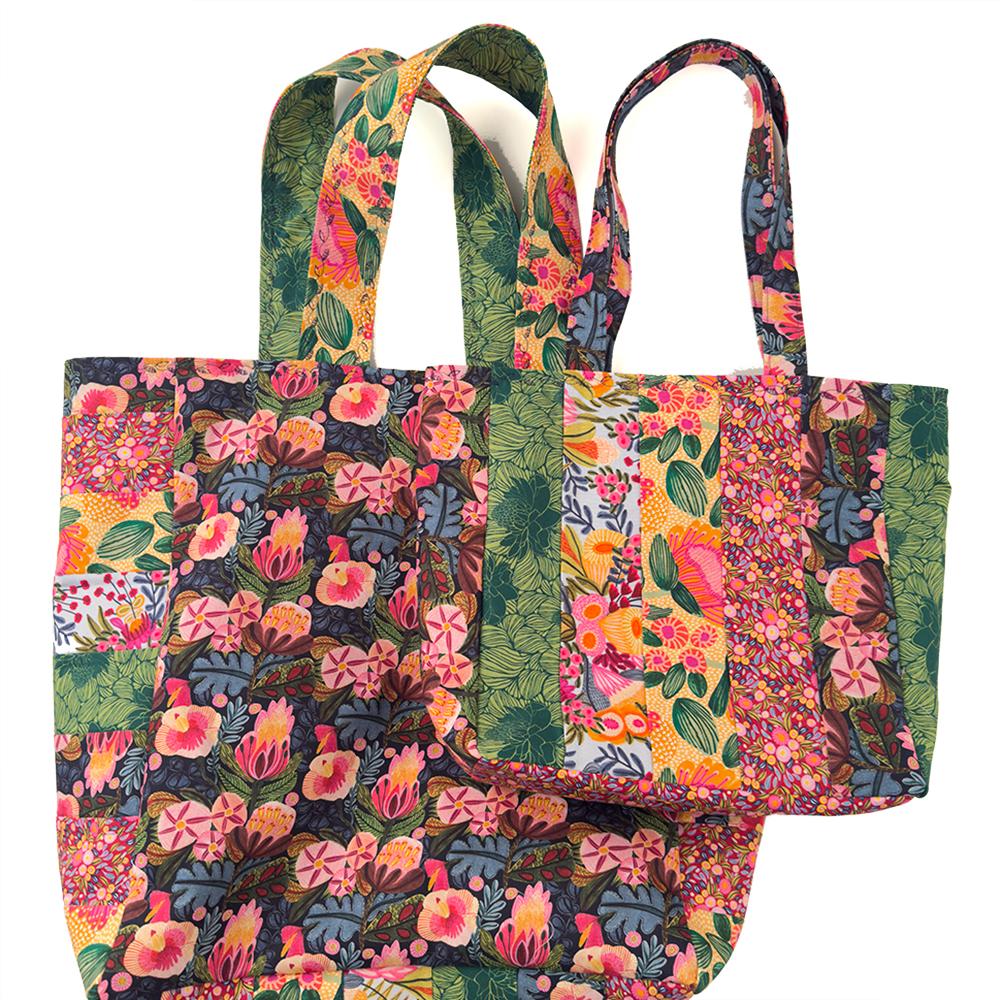 The Paradise Blooms fabric collection is inspired by the vibrant beauty of nature’s most captivating flowers. Celebrating the grandeur of proteas, banksias, and waratahs, this collection brings the essence of native flora and exotic flowers to life with a rich colour palette and enchanting designs. Be transported into a lush garden paradise, where each design blends bold and subtle elements that evoke creativity. This tote set has it all; style, beauty and functionality.