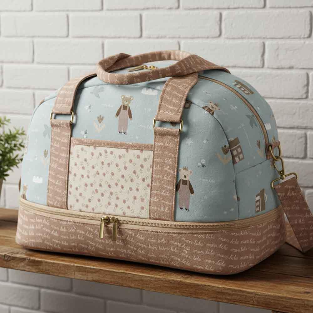 Townsend is a functional bag ideal for day trips and traveling! Used as a carry on, gym bag, weekender, doll bag, retreat bag, or however you’d like! The structured train case bottom is perfect for bulky items you want to protect, and have easy access to. The finished size of this bag is 16in wide at base, 13in high, and 6in deep. If you are concerned about sewing the train case bottom, I would suggest to make the entire bag out of quilting cotton first.
