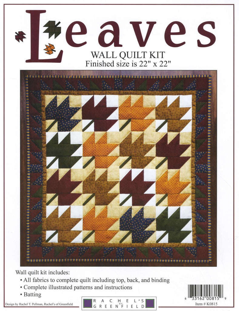 Crisp leaves in multiple colors cascade across this bright and perky wall quilt. A sawtooth border contains and complements the flurry. Construction is made simple with the use of large squares that are stitched, cut, and trimmed to create perfect triangle square units. Kit includes all fabrics (100% cotton) for quilt top, back, binding, batting, quilting suggestions, precise patterns and complete, illustrated instructions. Colors are red, green, blue, two shades of gold, and two shades of off-white. Finished Size: 22 inches x 22 inches.
