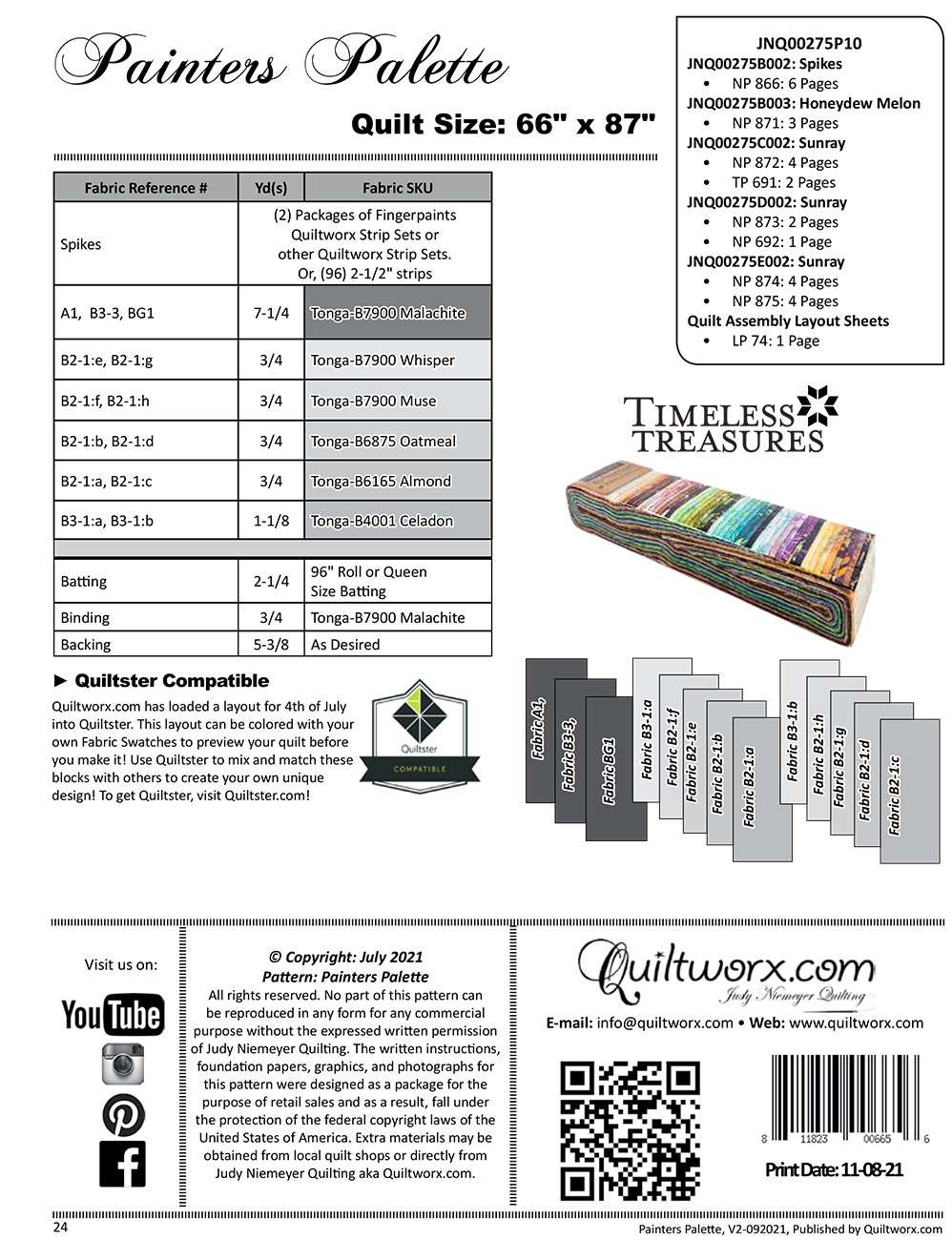 Painters Palette was designed by Quiltworx to use the (48) pack of 2-1/2" strips that Quiltworx has created. Pattern includes instructions, cover sheet, yardage information and foundation papers. Size 66" x 87"