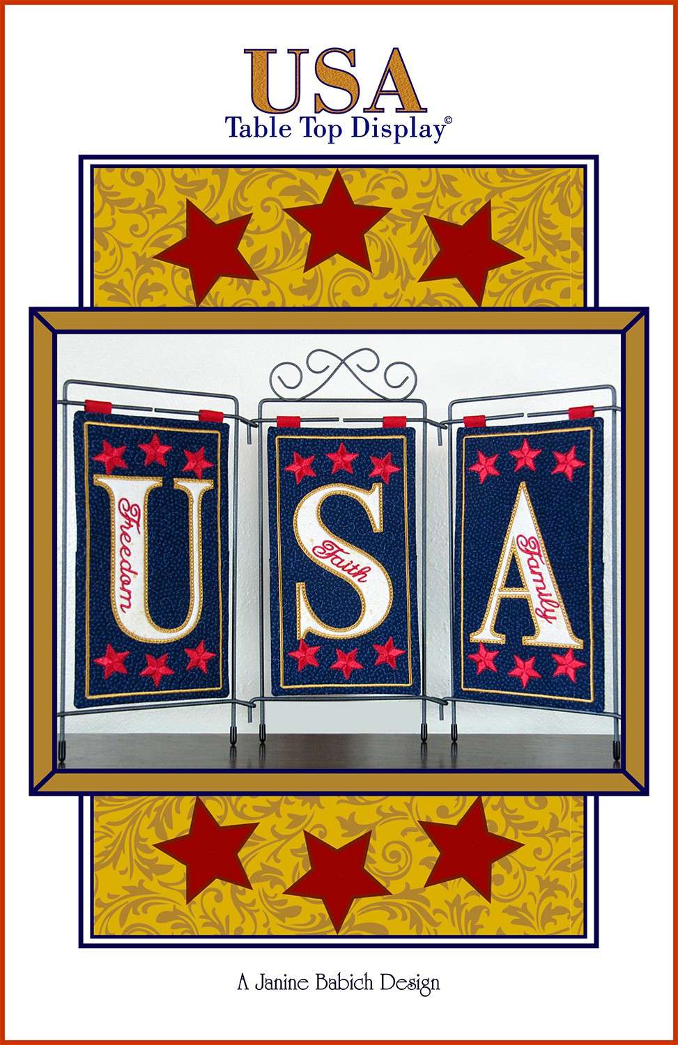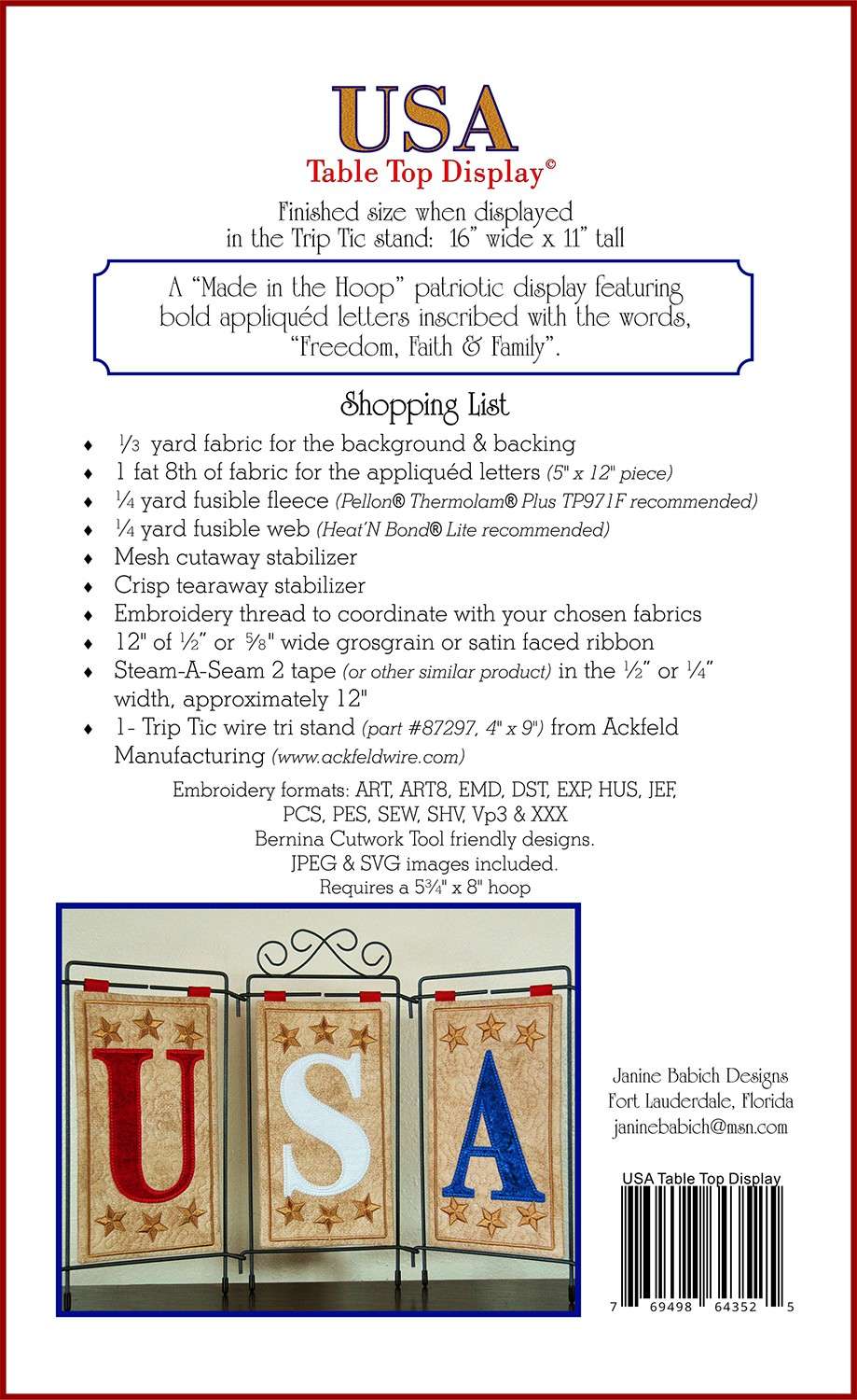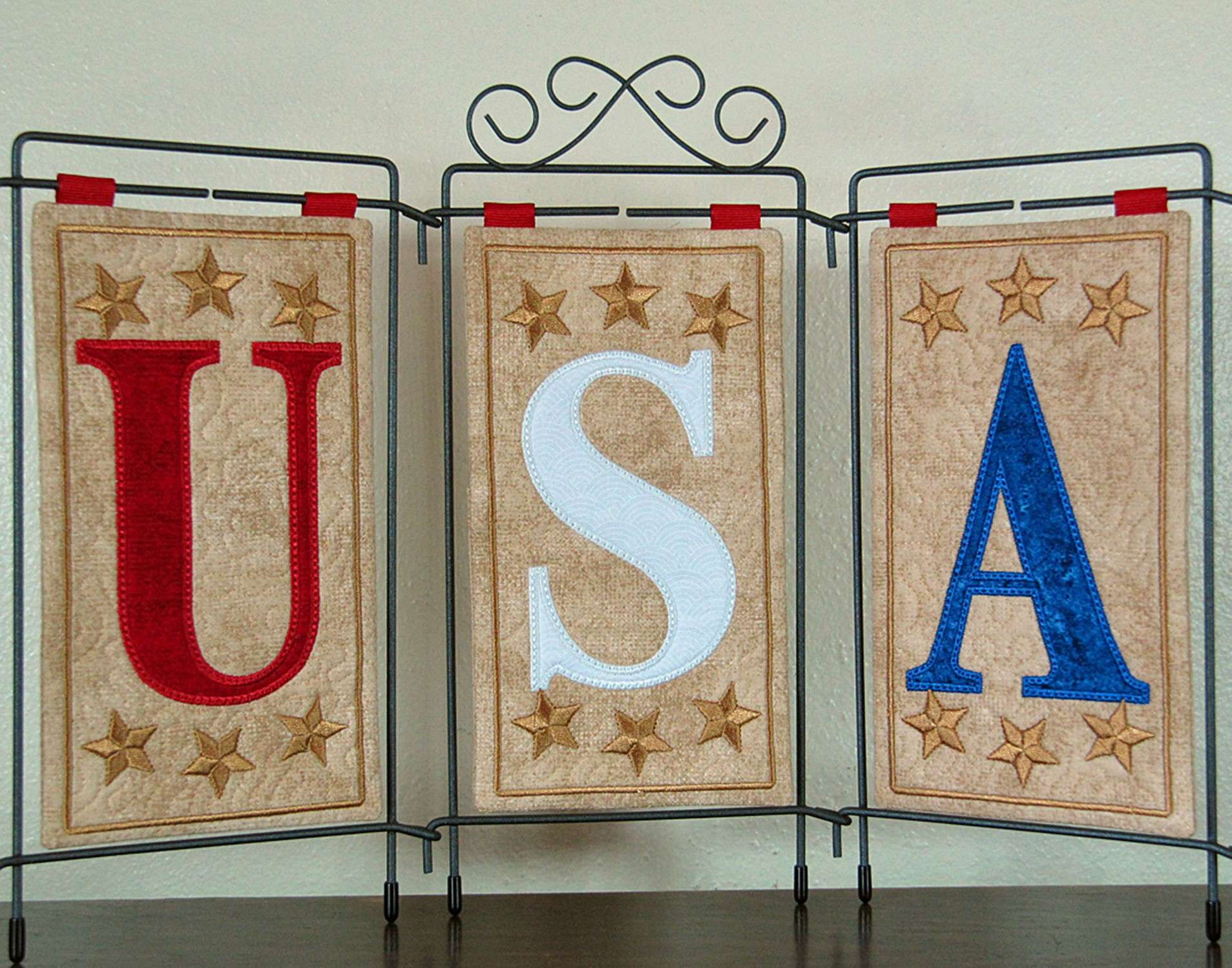 A Made in the Hoop patriotic display featuring big, bold appliqued letters inscribed with the words, Freedom, Faith & Family. Pattern CD includes embroidery formats: ART, ART8, EMD, EXP, DST, HUS, JEF, PCS, PES, SEW, SHV, VP3, XXX. Bernina cutwork tool friendly design. JPEG and SVG images included for use with digital cutting machines. Finished size (when displayed in a trip tic stand) 16 inches wide by 11 inches tall. Fabric not included.