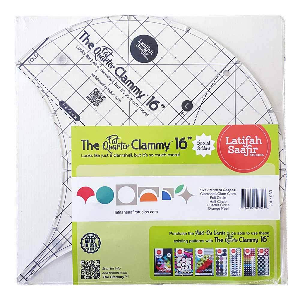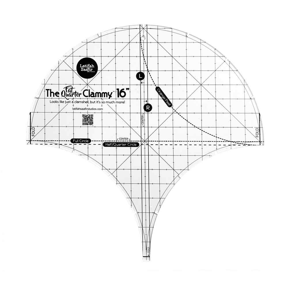 The “Fat Quarter” Clammy™ 16” is a Limited Edition giant clammy that is design to fit easily on fat quarters! Designed with the same innovation of the other multi function Clammy templates, you can use it to cut 16” finished clamshells, circles, half circles and 8½" finished quarter circles and orange peel shapes! The “Fat Quarter” Clammy™ 16" includes registration marks right on the template for easy transfer to your shapes. Currently, the updated Glam Clam™ and Clam Toss Quilts™ have been expanded to work with The “Fat Quarter” Clammy™ 16" with more patterns coming in the future.