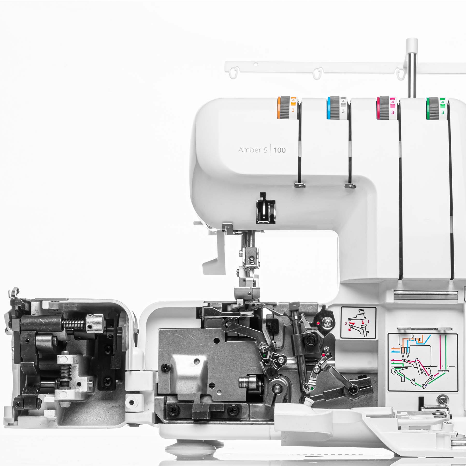 The AMBER™ S | 100 overlock machine has 4, 3, 2 thread capability with 16 different stitches to help you complete any project. Both the left and right front covers open to provide complete access to the looper area, making it super easy to thread. The Differential Feed gives you perfectly even seams - no stretching or distortion on knits or puckering of finer fabrics, and it can also be used for gathering. Packed with innovated features, including:
