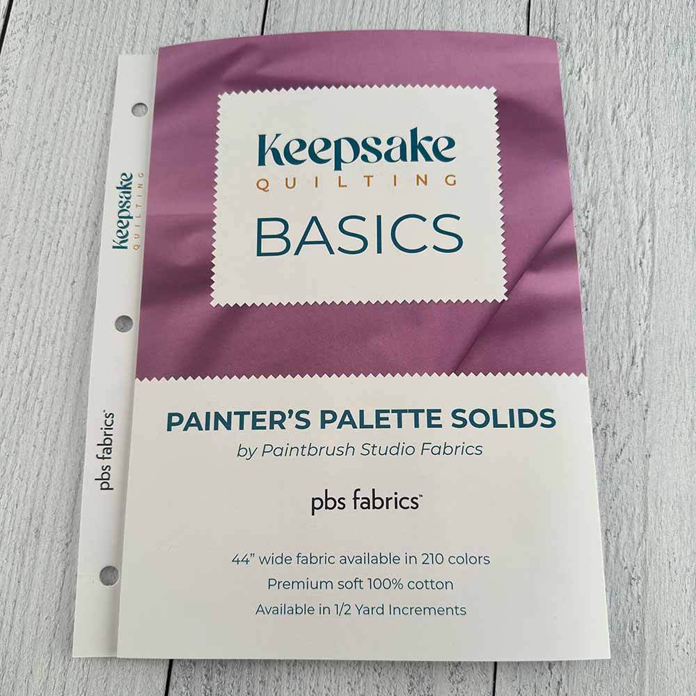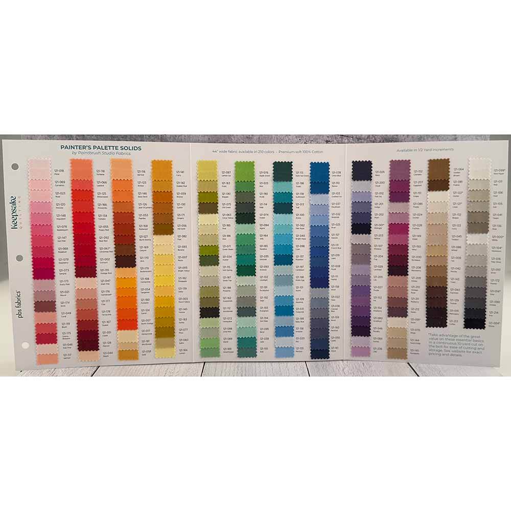 Like having your own little quilt store at your fingertips! Open card measures 23-3/4" x 11", folds to 8-1/2" x 11". Three holes punched for binder organization. Includes fabric swatches of all 210 colors of Painter's Palette Solids by Paintbrush Studio. Swatches measure 1" x 1". Includes vendor style/color number as well as Keepsake Quilting item number for easy ordering. Fabrcs are always in stock and available to order in 1/2 yard increments.