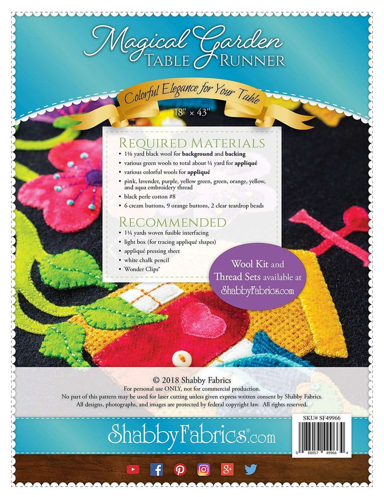 Whimsical cottages, vines, flowers, and butterflies are appliqued onto a deep black background to create an eye-popping, magical garden! In addition to the beautiful colors, there are numerous textures, buttons, beading, and hand stitching details that make up this extrordinary table runner! This table runner was designed with wool, but could be modified for quilting cotton as well. Includes tracing diagrams to maximize the use of your wool, as well as a full-size layout diagram. Finishes to 18" × 44"
