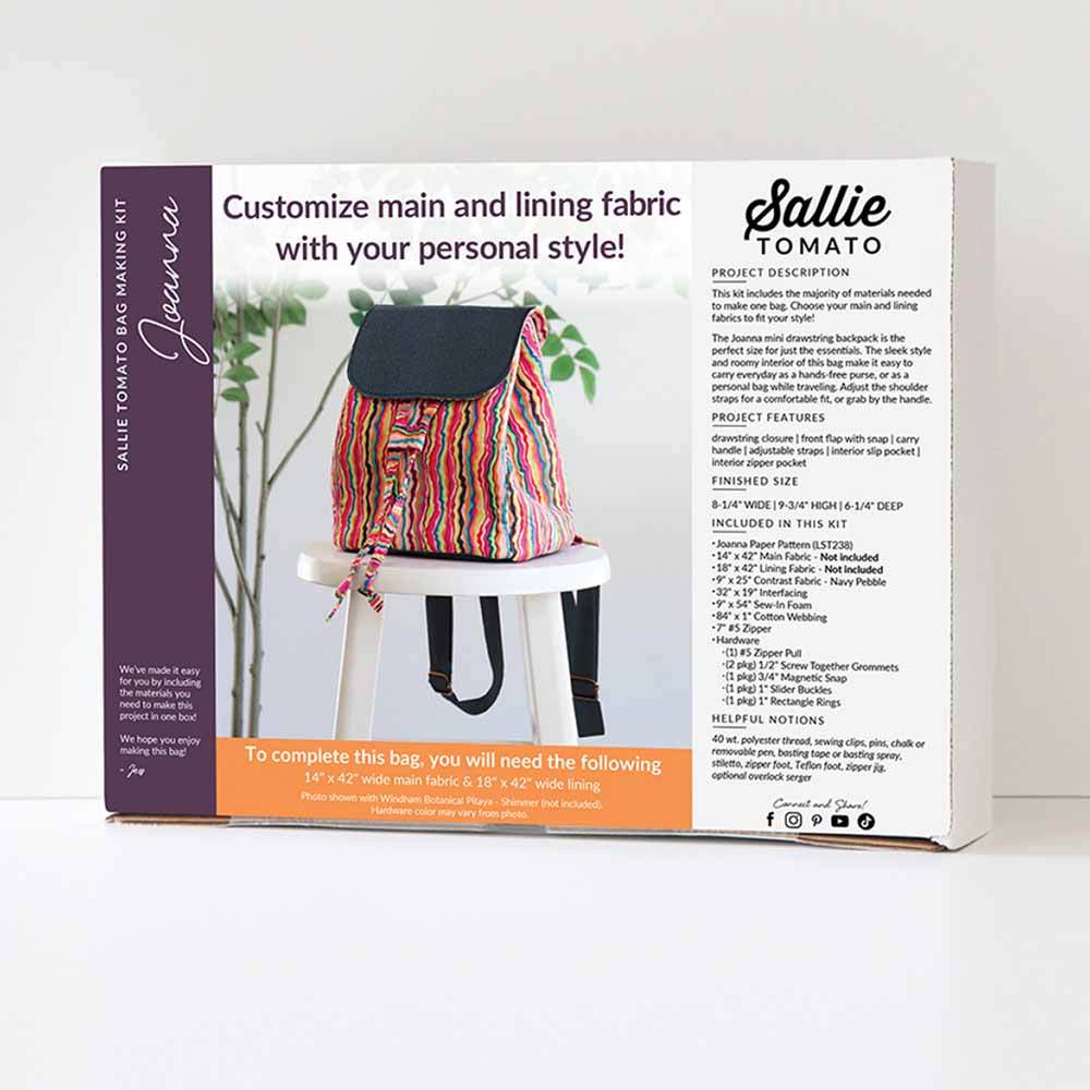 The Joanna mini drawstring backpack is the perfect size for just the essentials. The sleek style and roomy interior of this bag make it easy to carry everyday as a hands-free purse, or as a personal bag while traveling. Adjust the shoulder straps for a comfortable fit, or grab by the handle. The name and design of this pattern was inspired by the classic movie starring Audrey Hepburn, Two for the Road. Finished size: 9-3/4"" high, 8-1/4"" wide, and 6-1/4"" deep.