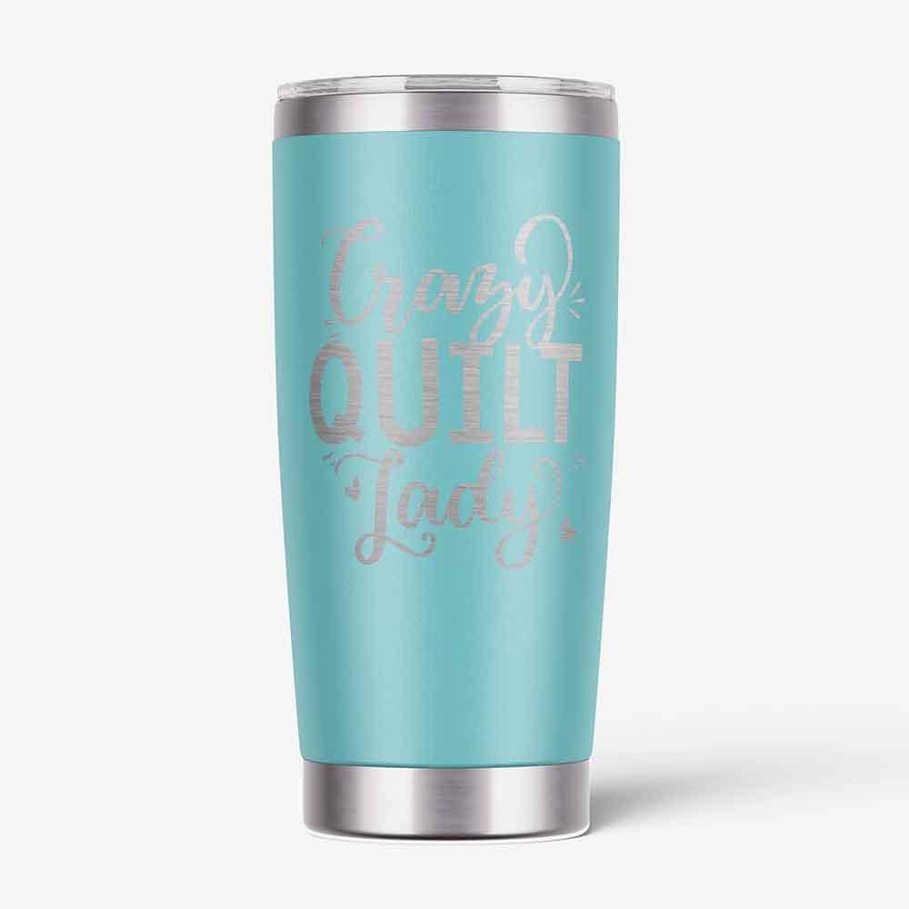 This 20 oz tumbler is laser engraved with "Crazy Quilt Lady". These high-quality, double wall, vacuum-sealed tumblers keep drinks cold or hot for hours on end and fit perfectly in a standard size cup holder. Top rack dishwasher or hand wash. Do not use in microwave.