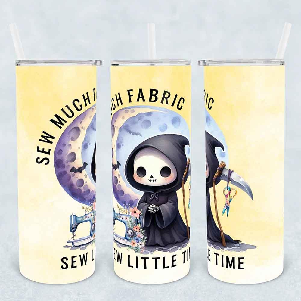 Cute SEW MUCH FABRIC SEW LITTLE TIME design is permanently dyed onto this tumbler. Designed to keep your hot drinks hot for up to 6 hours and your ice-cold drinks cold for 24+ hours, this 20oz. skinny tumbler is made from premium, kitchen-grade stainless steel that will not absorb odors and is double wall vacuum insulated to prevent condensation from building up on the outside of the bottle. Included is a slide-lock, leak-proof sip lid and plastic straw. This design is perfect for any sized hands and fits in all standard size cup holders. Not recommended for the dishwasher.