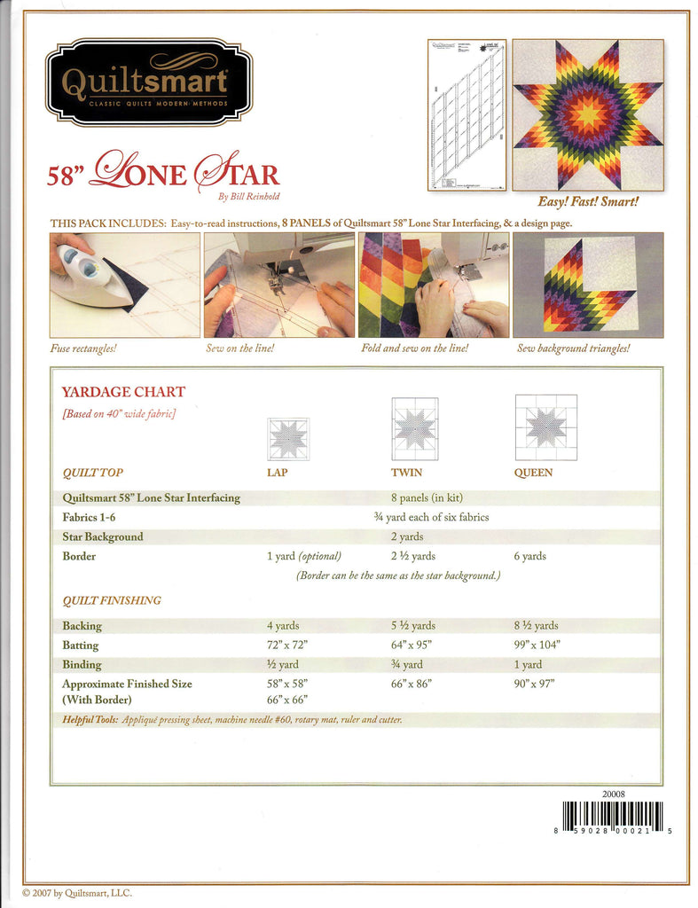 Lone Star Classic includes: Easy to read instructions, 8 panels of Quiltsmart 58 inch Lone Star Interfacing, and a design page - packed in a vinyl zippered pouch. Projects include a Lap Quilt, Twin Quilt and a Queen Quilt. Fabric not included.