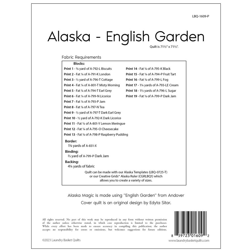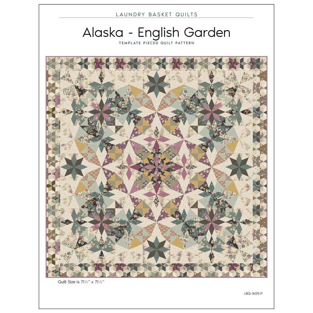 Alaska Quilt Size is 71.5in x 71.5in. This beautiful quilt looks wonderful in any color combinations. It is perfect for a block of the month project and uses just 6 fabrics for the entire quilt. The pattern includes paper templates to complete the project.