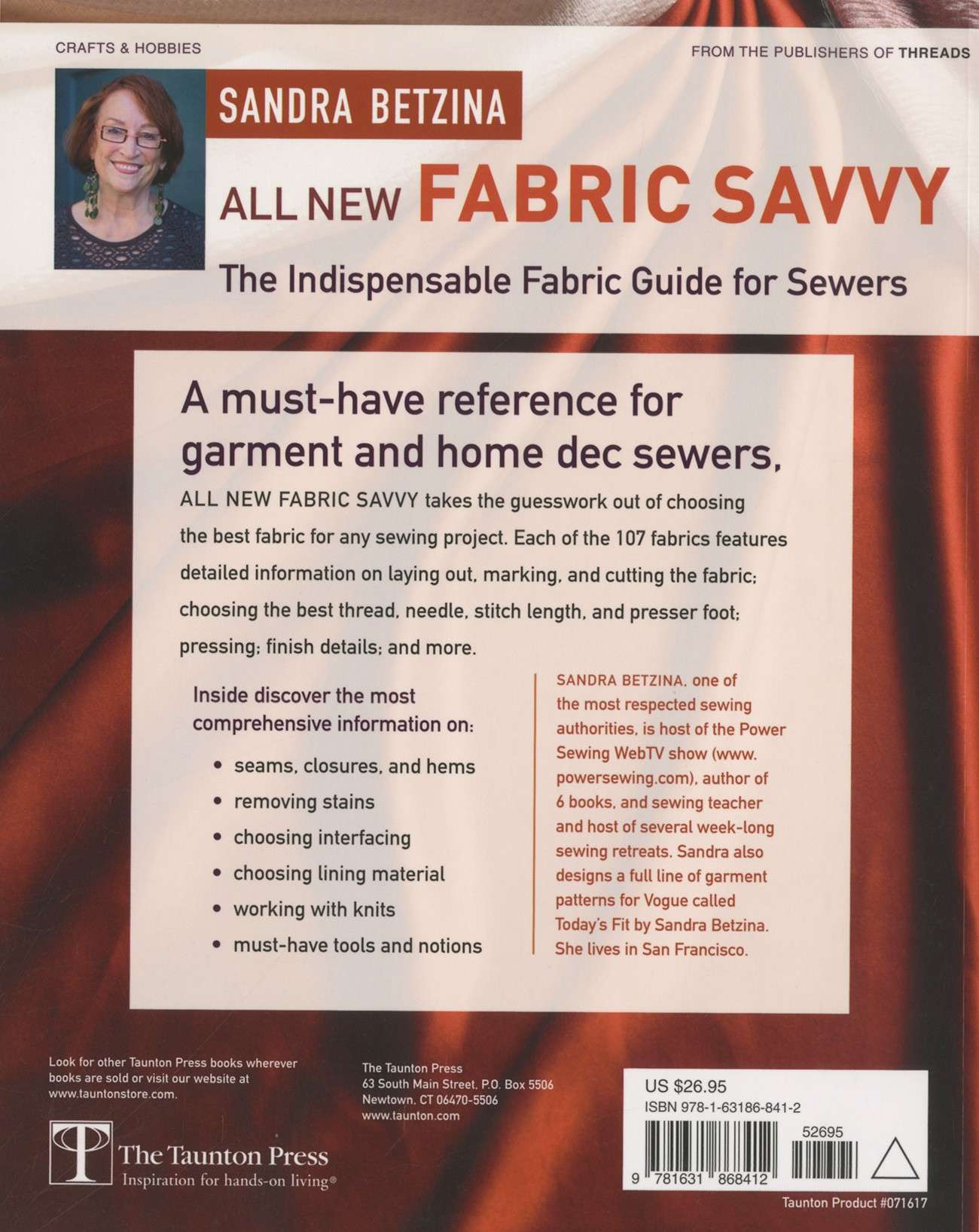The essential guide for every sewer just got better! All New Fabric Savvy is updated to include detailed information on 107 different fabrics; must-know information on determining fabric content, working with knits, working with different types of interfacing, removing stains, and choosing lining material; recommended tools and notions; illustrated reference sections on seams, details, closures, and hems; 476 photographs and 110 illustrations.