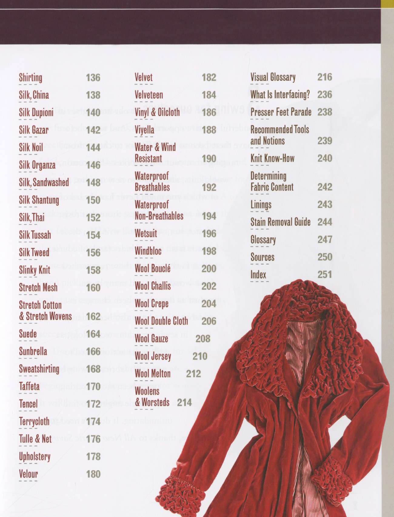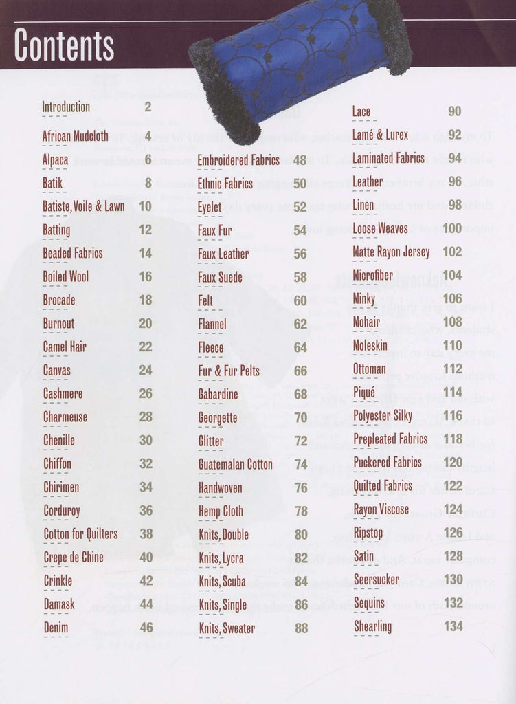 Organized alphabetically, the 107 fabrics include old favorites. like cotton, wool, knits, and silks to new options, some of which you might never have heard of or sewn with--synthetics; those that resist water, sun, stains, and wrinkles; those made from animal hides (and, of course, their faux cousins) those regenerated from wood pulp and many more.